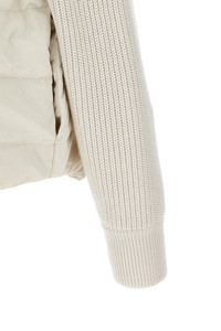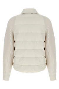 cod. MD5997695PC1709 Two-material water-repellent nylon down jacket with goose down padded with virgin wool, cashmere and silk knit sleeves, shirt collar, front snap button closure, pockets with Monile 'Shiny Flap Detail', wide long sleeves with cuffs. Color: White Size & Fit: Boxy fit Composition: 74% polyamide, 26% cotton Made in: Italy