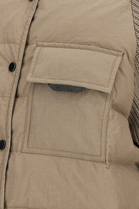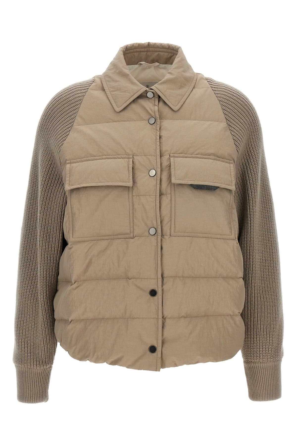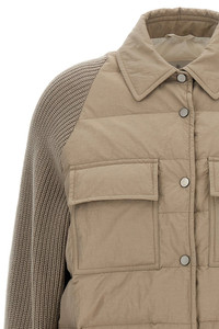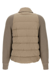 cod. MD5997695PC9123 Two-material water-repellent nylon down jacket with goose down padded with virgin wool, cashmere and silk knit sleeves, shirt collar, front snap button closure, pockets with Monile 'Shiny Flap Detail', wide long sleeves with cuffs. Color: Beige Size & Fit: Boxy fit Composition: 74% polyamide, 26% cotton Made in: Italy