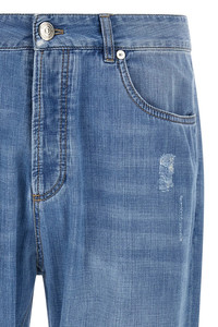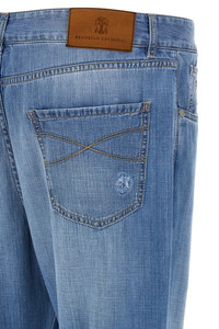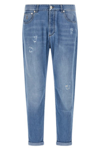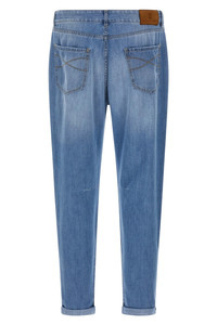 cod. ME645X2340C1470 Used-effect stonewashed cotton denim jeans, contrast stitching, logo embroidery and front button closure, turn-up hem, and leather logo label on the back. Color: Light Blue Size & Fit: leisure fit Composition: 100% cotton Made in: Italy