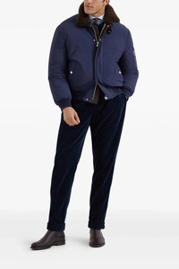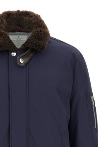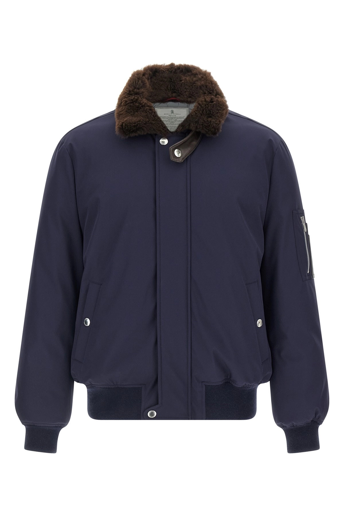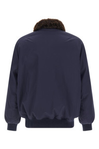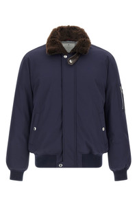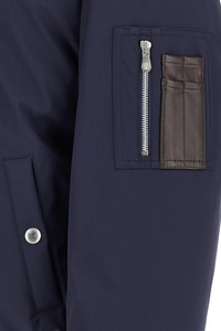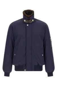 cod. MV4061625CXM22 Water-repellent stretch membrane nylon short bomber jacket, quilted nylon lining and goose down padding, contrast leather and tone-on-tone stretch wool knit details, shearling lined high neck with removable chin strap, zip and front snap button closure, pockets, long cuffed sleeves, elastic band on the hem. Color: Blue Size & Fit: true to size fit Composition: 88% polyamide, 12% elastane Made in: Italy
