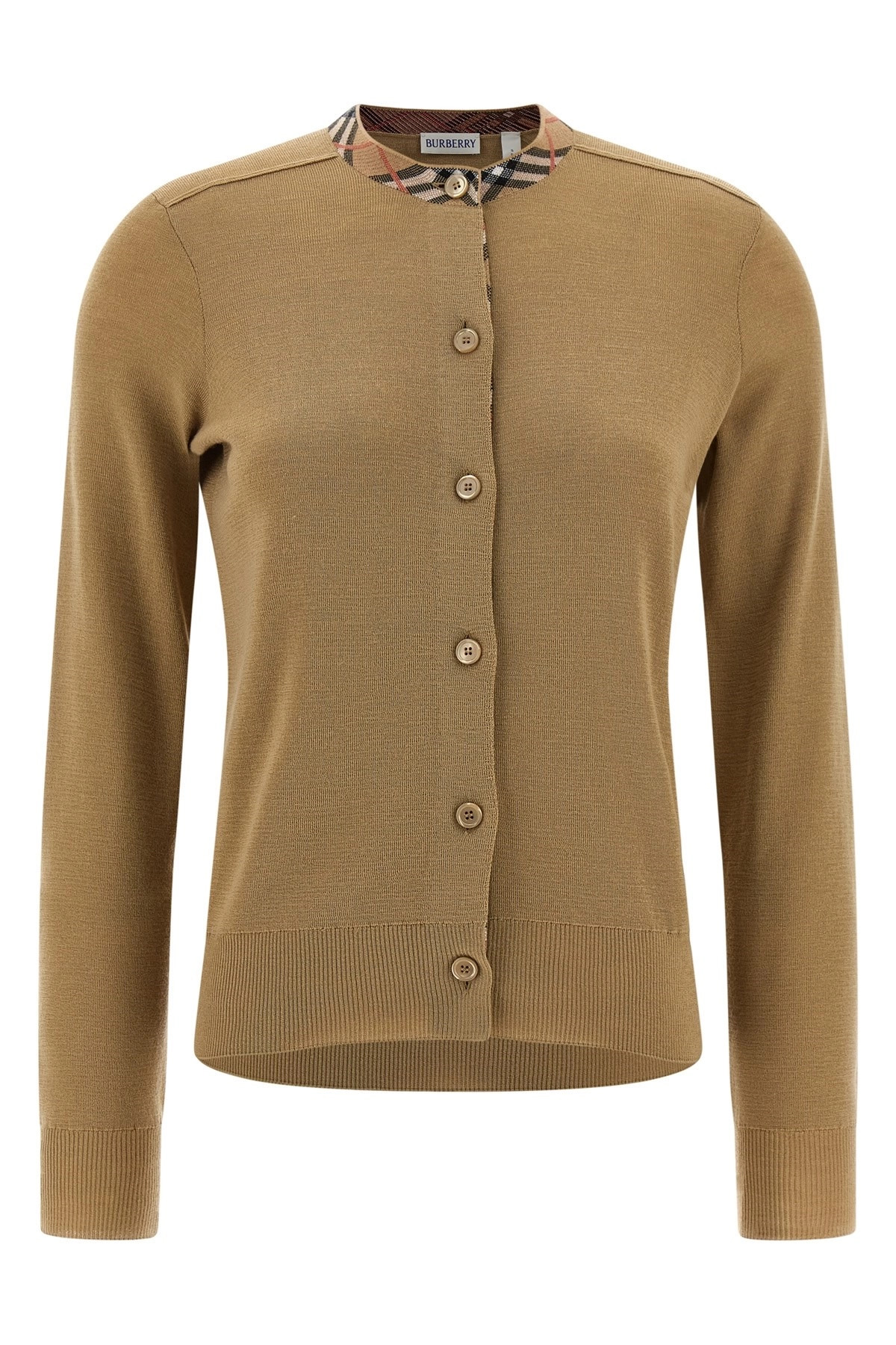 cod. 8112164FLAX Wool knit cardigan with crew neck with check insert, front button closure, long sleeves with cuffs. Color: Beige Size & Fit: True to size fit Composition: 100% wool Made in: Italy