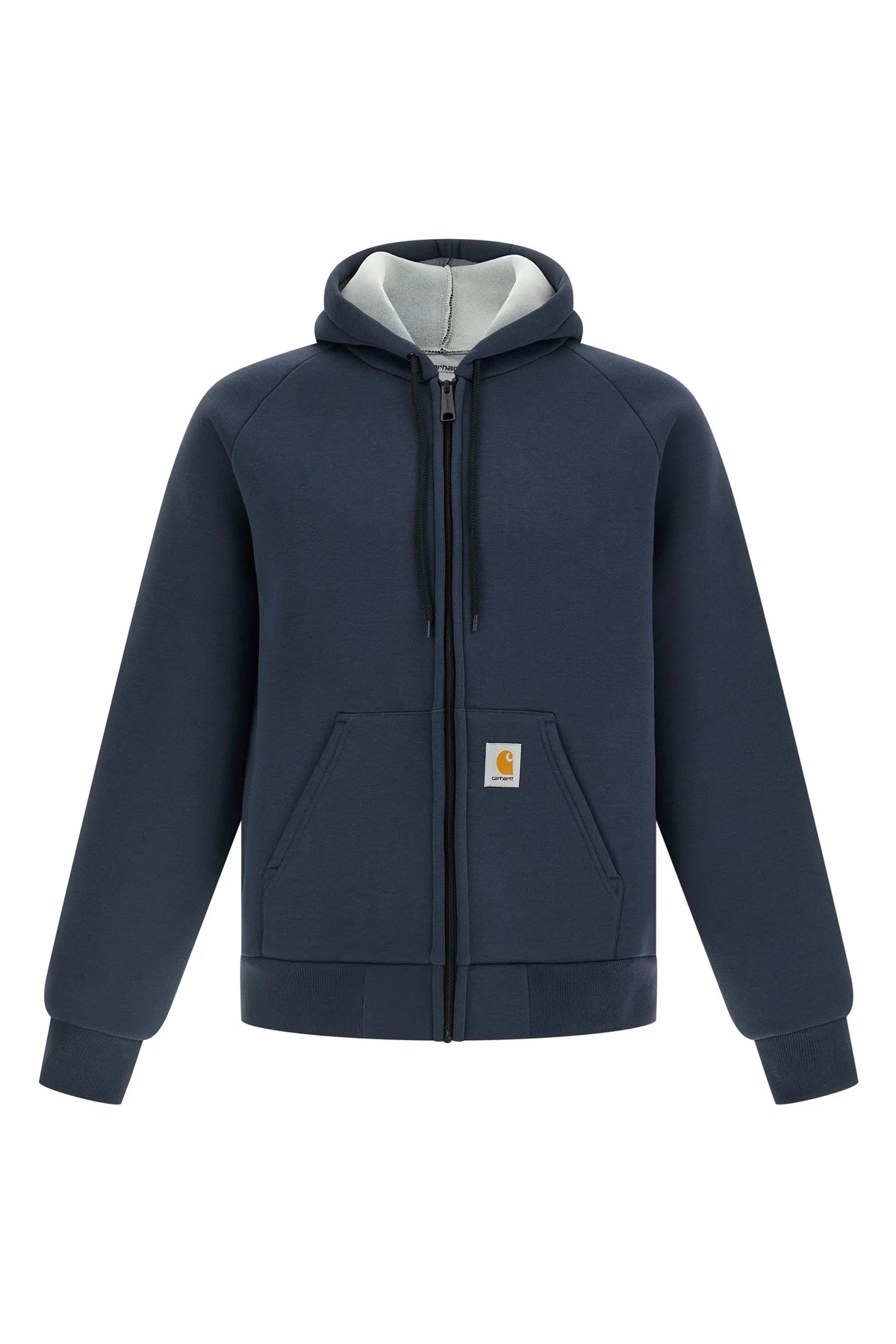 cod. I0329353BHXX 'Car-Lux' heavy cotton and polyester blend jacket with neoprene effect, velvet lining, adjustable hood, front zip patch and closure, pockets, long cuffed sleeves. Color: Blue Size & Fit: true to size fit Composition: 50% polyester, 50% cotton Made in: Turkey
