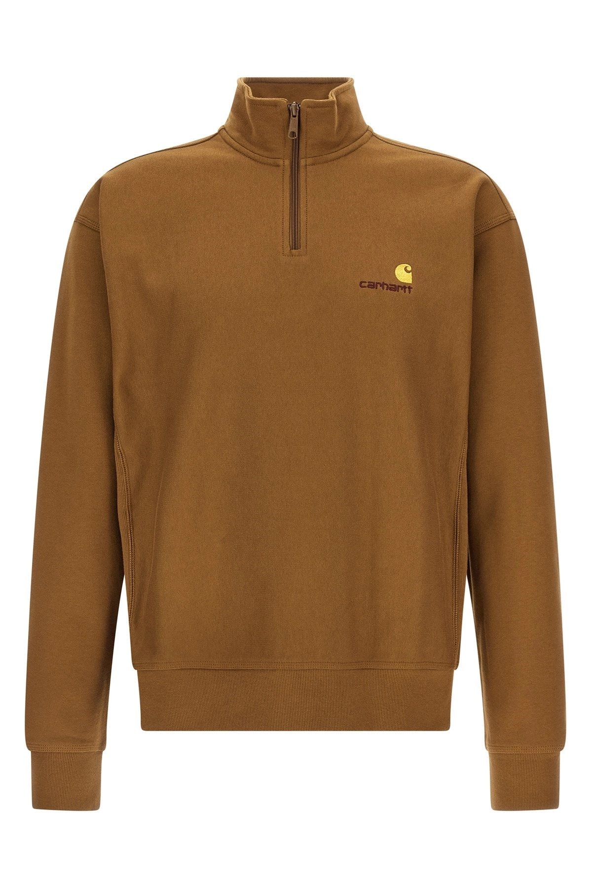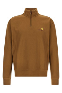 cod. I027014HZXX 'Half zip American Script sweat' cotton blend sweatshirt with high neck with half zip, front logo embroidery, long cuffed sleeves. Color: Brown Size & Fit: True to size fit Composition: 80% cotton, 20% polyester Made in: Cambodia