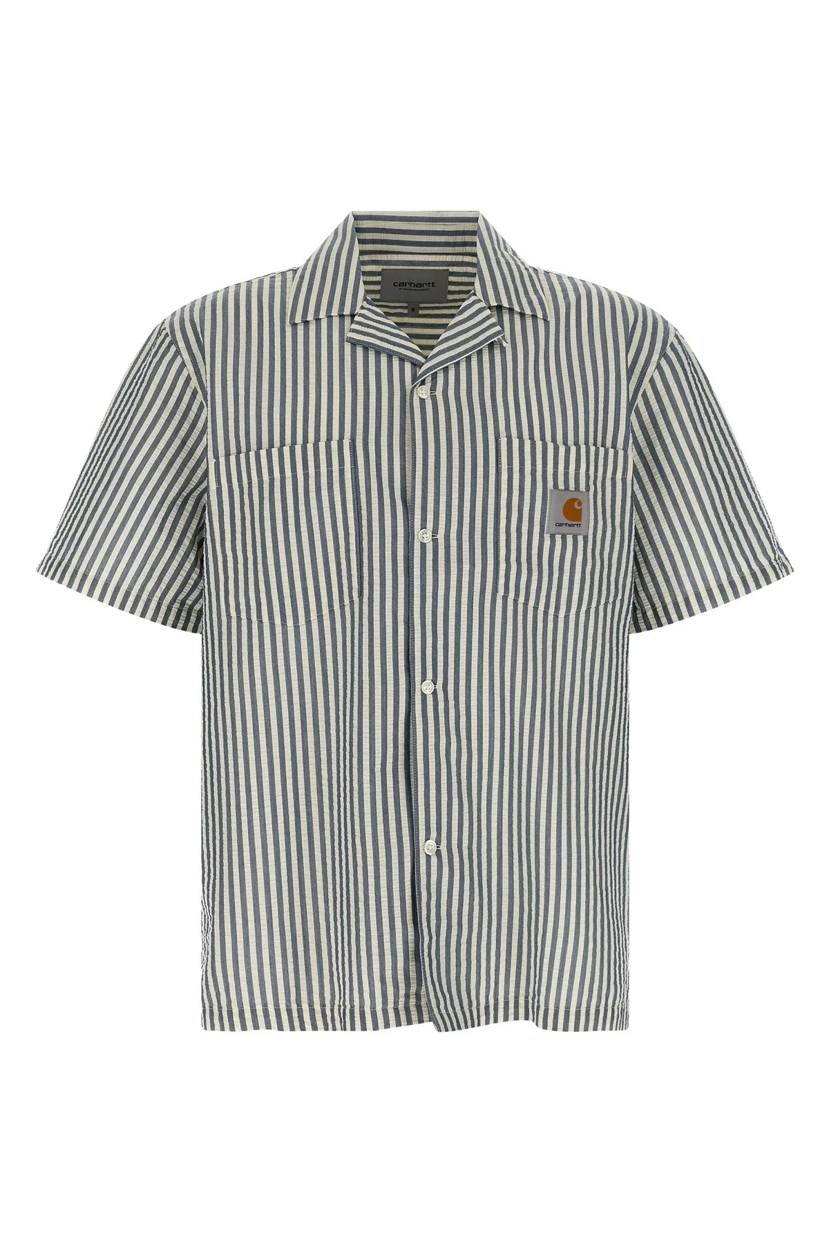 cod. I0362033K5XX 'Leavel' shirt in lightweight polyester and cotton seersucker with vertical stripes, bowling style, logo patch and front mother-of-pearl button closure, pockets, short sleeves, side slits. Color: Blue Size & Fit: Comfort fit Composition: 70% cotton, 30% polyester Made in: Vietnam