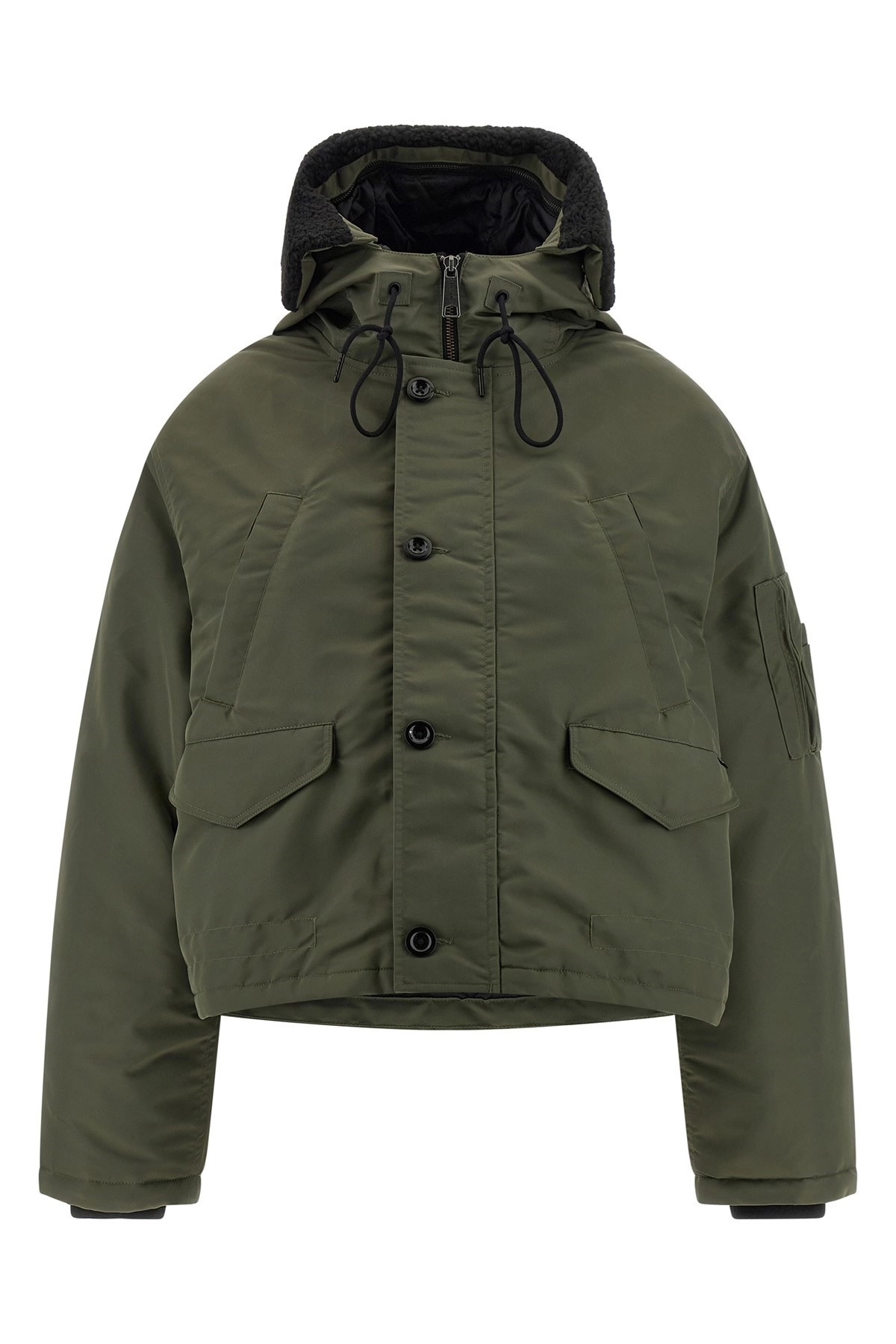 cod. I03531863XX 'Oltera' water-repellent medium weight nylon fabric jacket, diamond-shaped quilted lining, adjustable hood with removable teddy-effect fleece insert, crop style, high neck, front zip and button closure, pockets, long sleeves with stretch knit cuffs, drawstring on the hem. Color: Green Size & Fit: true to size fit Composition: 100% nylon Made in: Cambodia