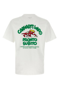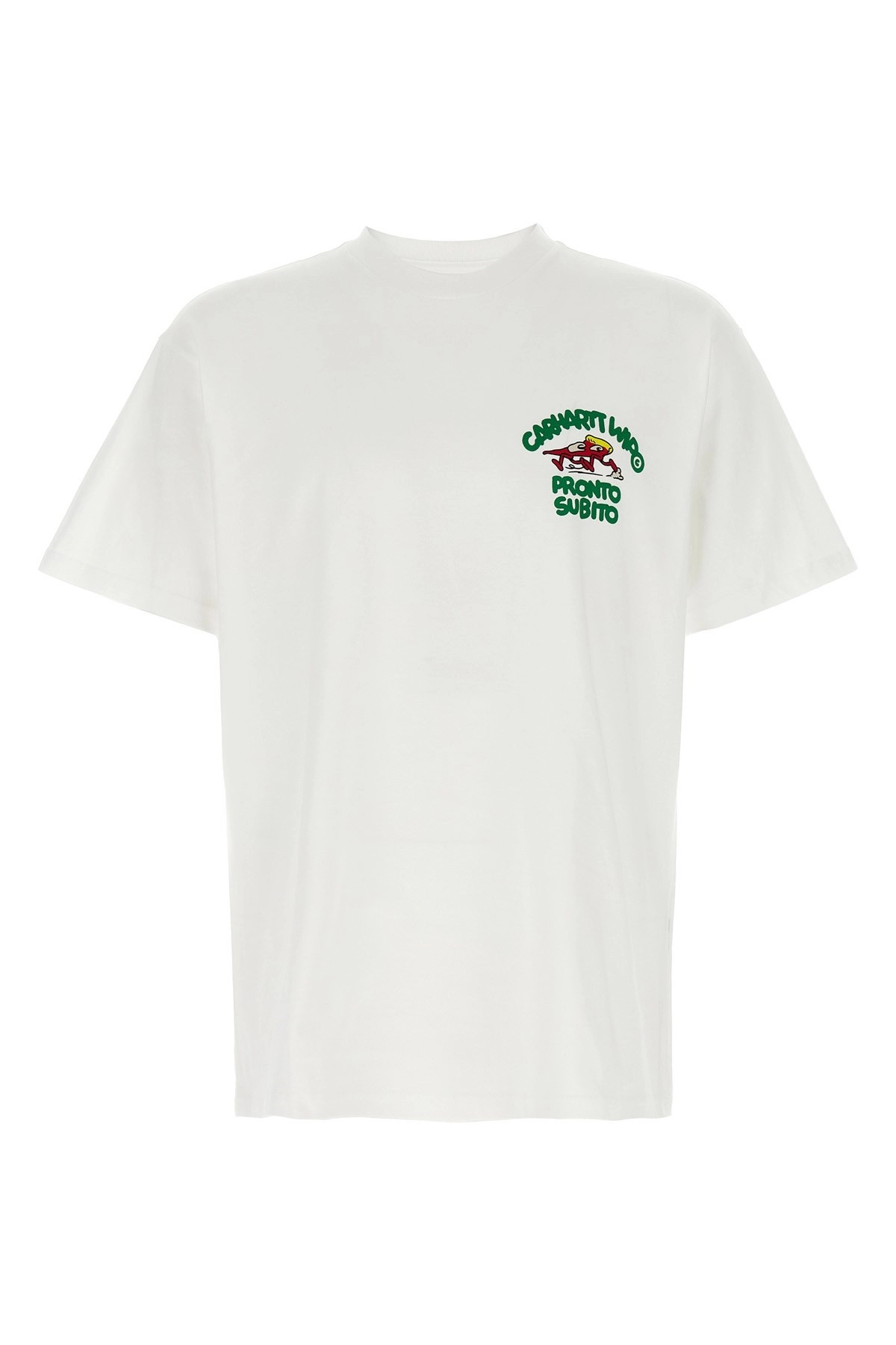 cod. I03519502XX 'Pronto' light cotton jersey T-shirt with front and back print, crew neck, short sleeves with dropped shoulders. SUSTAINABLE: This product is made of organic cotton. Color: White Size & Fit: Loose fit Composition: 100% organic cotton Made in: Bulgaria