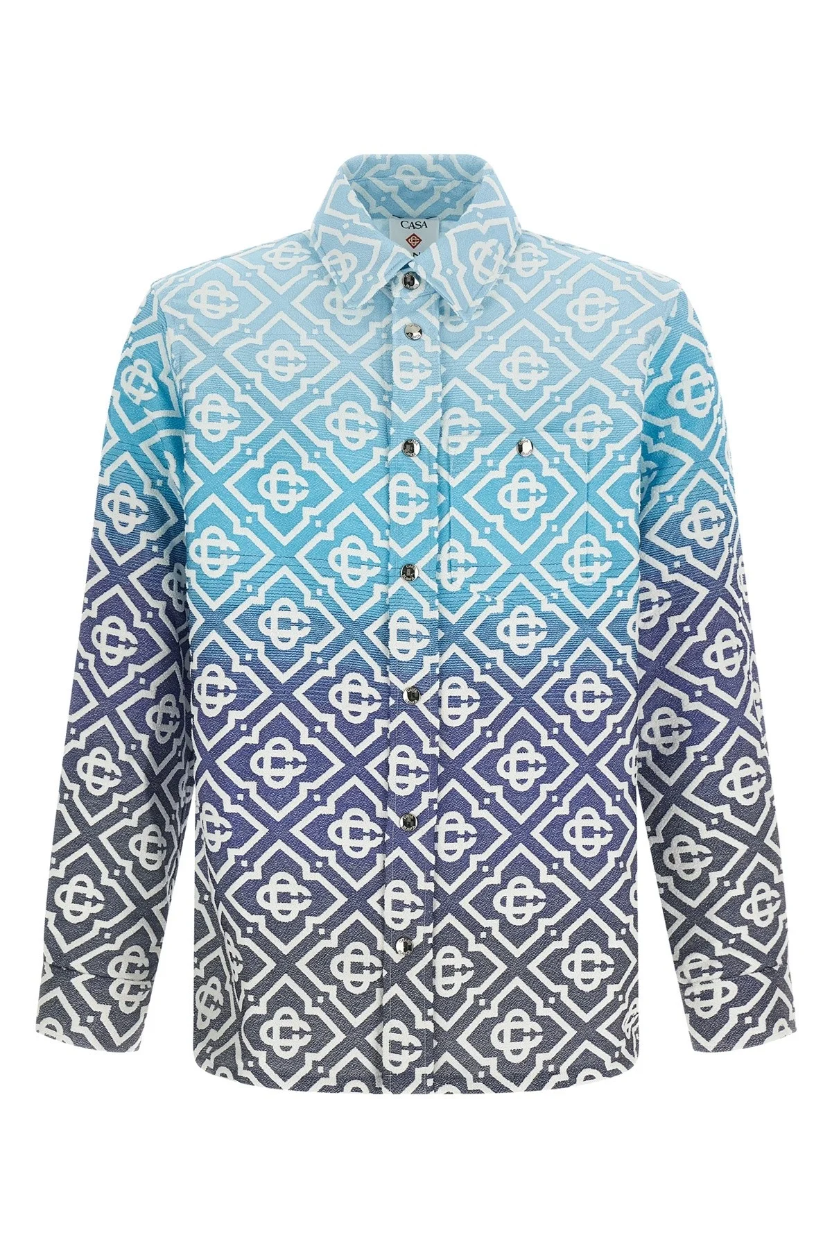 cod. MSP26JK44901 'Monogram Gradient Jacquard' unlined Monogram jacquard fabric with gradient effect, pocket, front snap button closure, long cuffed sleeves and dropped shoulder. Color: Blue Size & Fit: Relaxed fit Composition: 36% cotton 26% polyester 24% polyamide 13% viscose 1% elastane Made in: Italy