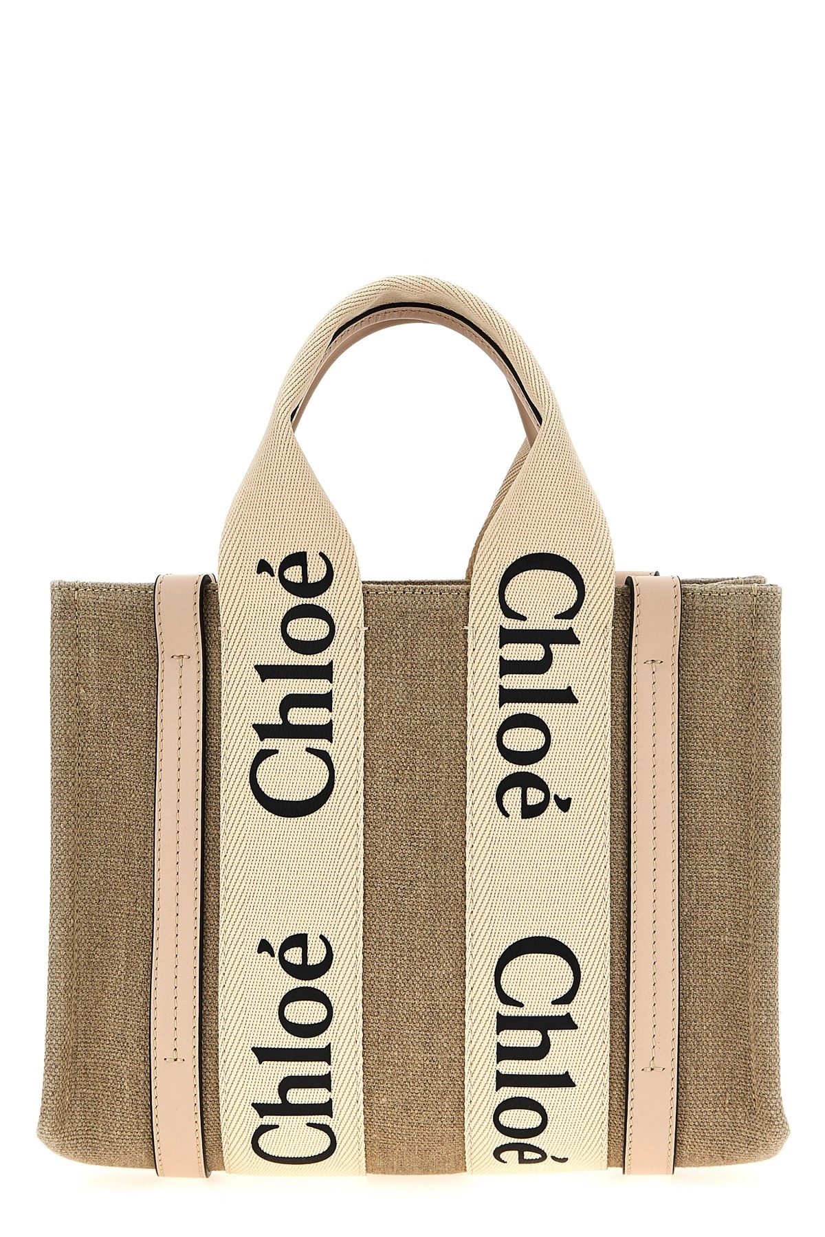 cod. CHC22AS397I266J5 Small 'Woody' linen canvas handbag with leather details, double fixed handle in logo canvas, adjustable and removable leather shoulder strap. Color: Pink Size & Fit: W 26.5 x H 20 x D 8 cm Composition: 100% linen Made in: Italy