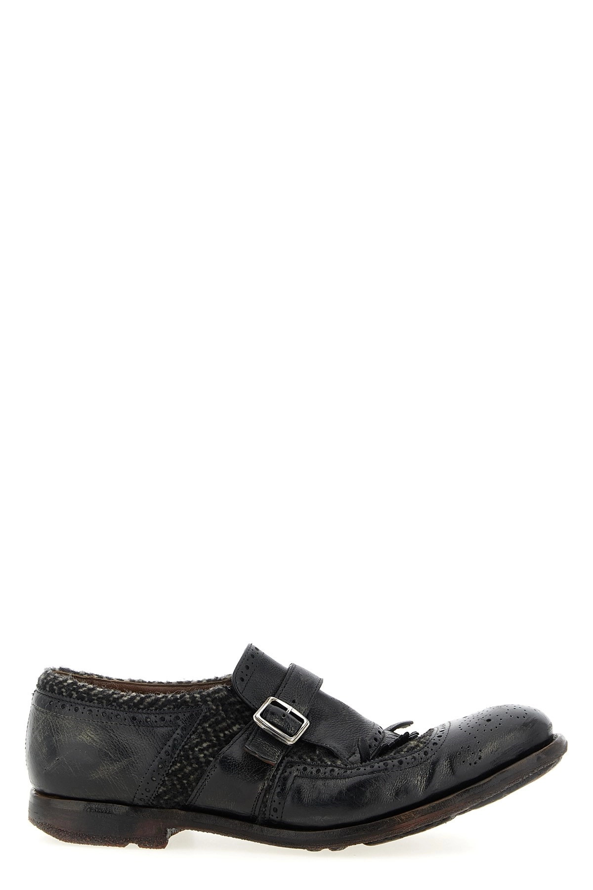 cod. EOG001FG000009ABRF0AAB 'Shanghai' vintage-effect leather loafers with houndstooth wool inserts, front fringes and buckle, leather and rubber sole. Color: Black Size & Fit: UK MEN Composition: 100% calfskin leather (Bos Taurus) Made in: Italy