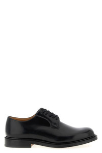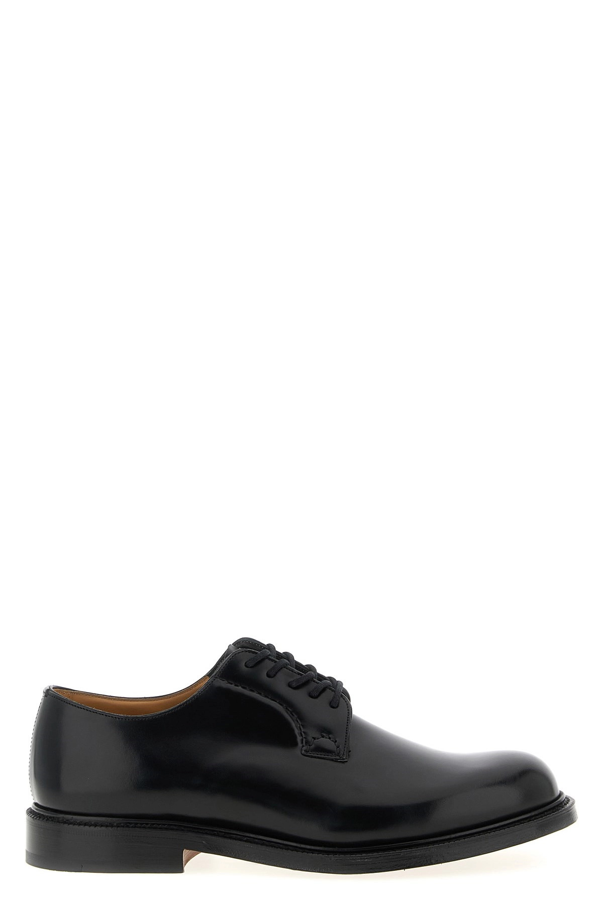 cod. EEB001FG000009XVF0AAB 'Shannon' derby in polished brushed calf leather, rounded toe, lace-up closure, triple leather sole with rain welt. Color: Black Size & Fit: UK MEN Composition: 100% calfskin leather Made in: United Kingdom