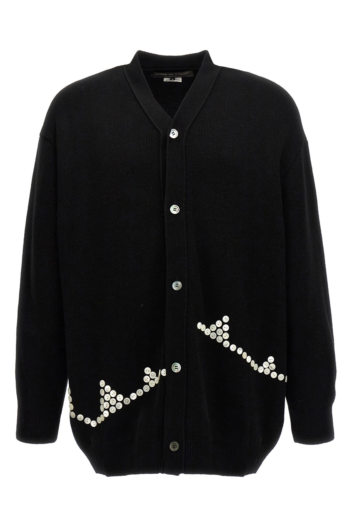 cod. PNN0071 Wool blend sweater with all-over button detail, button closure, long cuffed sleeves. Color: Black Size & Fit: true to size fit Composition: 70% acrylic 30% wool Made in: Japan