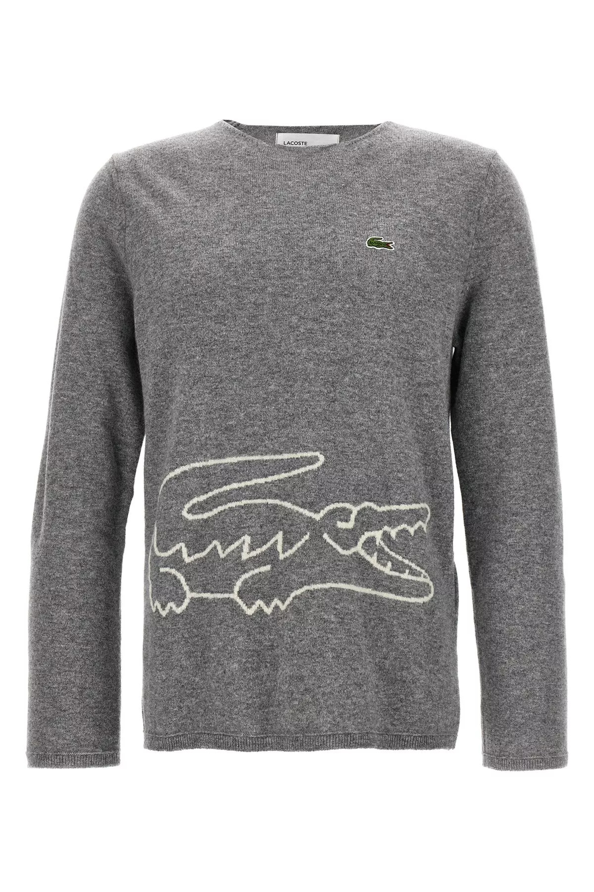cod. FLN003W233 Comme Des Garcons x Lacoste wool, crewneck sweater with intarsia and logo patch. Color: Gray Size & Fit: true to size fit Composition: 100% wool