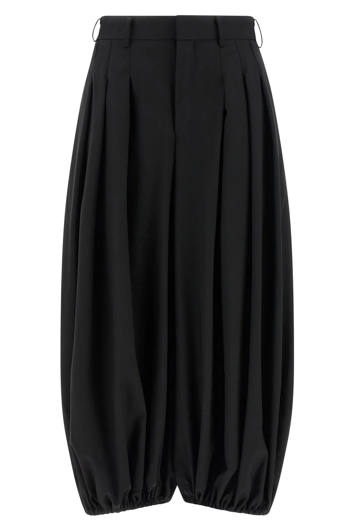 cod. GQP0161 Zuava wool pants, extra wide leg, front and back pincer, zip hook and front button closure, pockets, elastic at the bottom of the leg. Color: Black Composition: 100% wool Made in: Japan