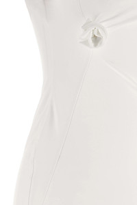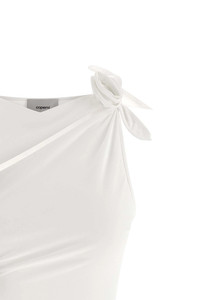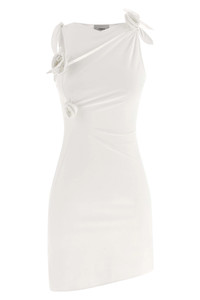 cod. COPR154F5021WHT 'Asymmetric Flower' sleeveless minidress in stretch fabric with cut-out details and floral decorations, asymmetrical hem with side splits. Color: White Size & Fit: true to size fit Composition: 78% polyamide, 22% elastane Made in: France