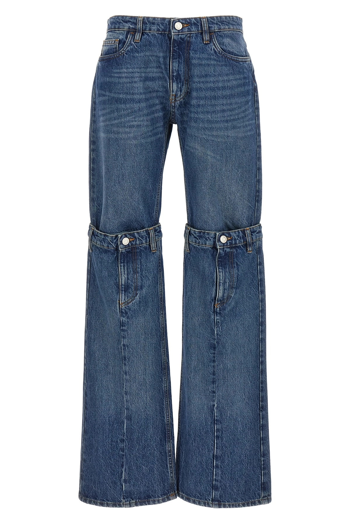 cod. COPP55252BLUE 'Open Knee' cotton denim jeans with zip and button closure, five pockets, half-leg cut-out detail, wide leg. Color: Blue Size & Fit: true to size fit Composition: 100% cotton Made in: Italy
