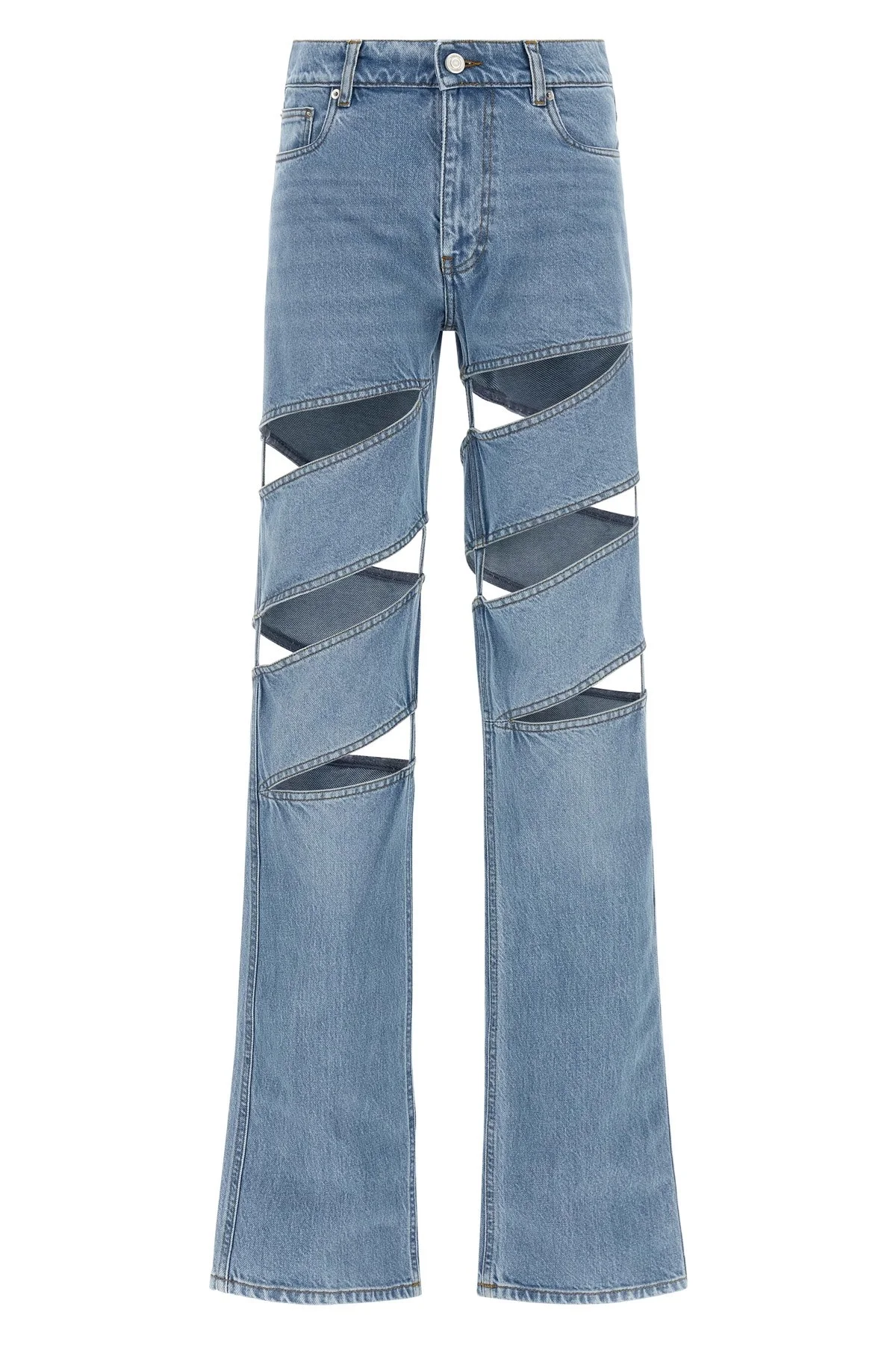 cod. COPP169F2054BLU 'Spiral' stonewashed cotton denim jeans with contrast stitching, asymmetrical cut-outs on the front and back, straight leg, front zip and button closure, five pockets, back logo tag. SUSTAINABLE: This product is made of organic cotton. Color: Light Blue Size & Fit: true to size fit - FRENCH size Composition: 100% organic cotton Made in: Portugal