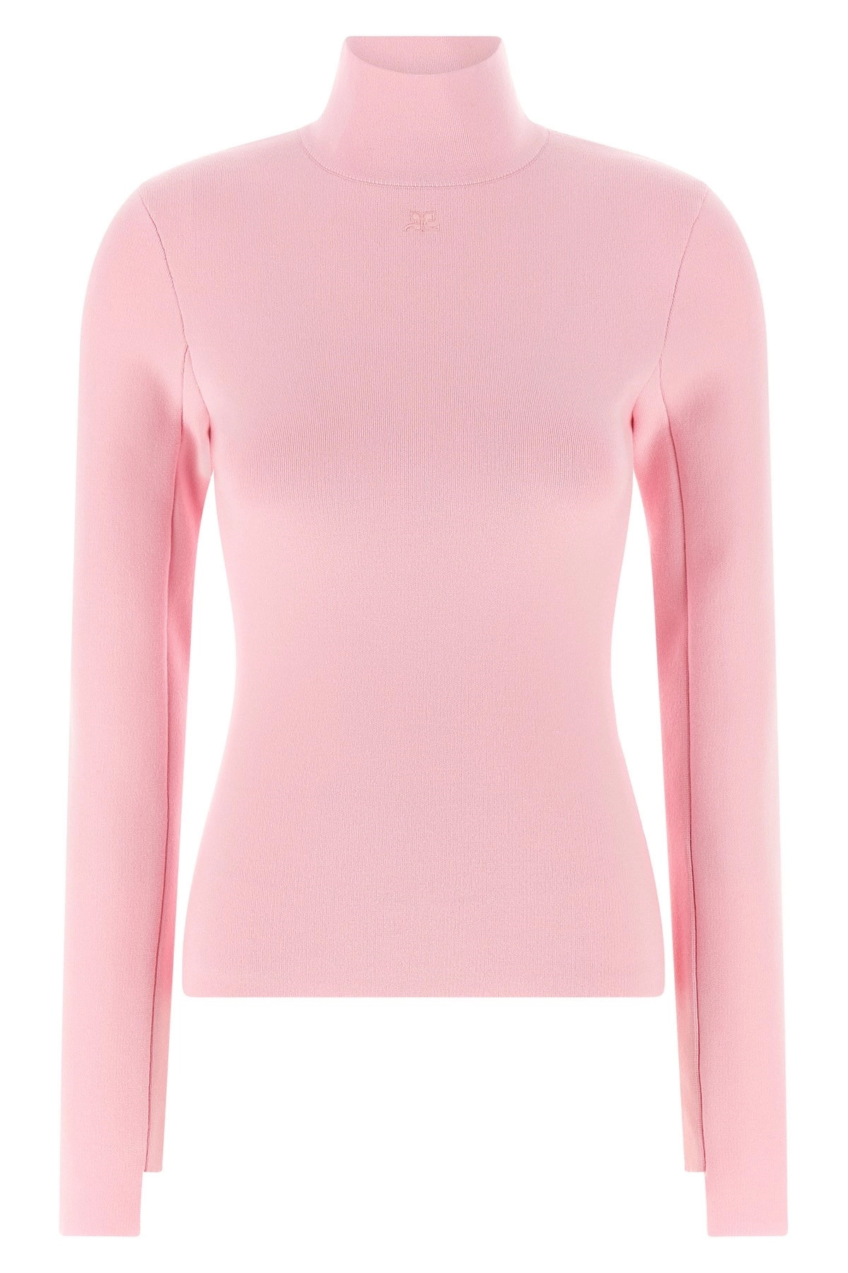 cod. 425MPU260FI00015011 Interlock viscose sweater, tone-on-tone logo embroidery on the front, high neck, long sleeves. Color: Pink Size & Fit: true to size fit Composition: 70% viscose, 30% polyester Made in: Bulgaria