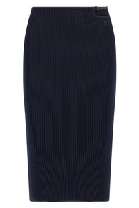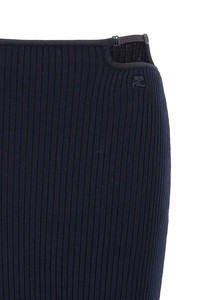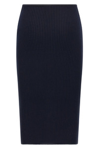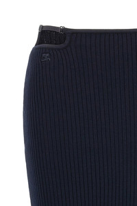 cod. 125MJU232FI00017075 'Loop Rib knit' ribbed knit midi skirt, cut-out detail at the waist with adjustable strap, tonal logo patch. Color: Blue Size & Fit: True to size fit Composition: 70% viscose, 30% polyester Made in: Bulgaria