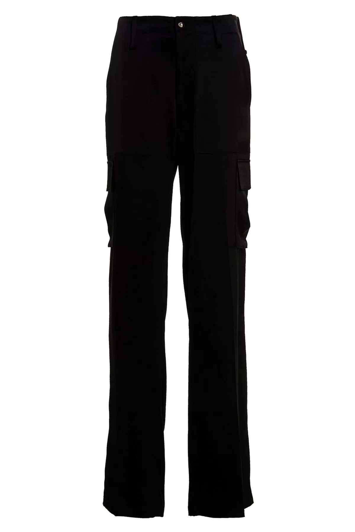 cod. RE23DK58TRBLACK Satin cargo pants with zip and button closure, multi pockets and a central pleat leg. Color: Black Size & Fit: True to size fit UK size Composition: 78% 78% 22% polyester Made in: United Kingdom