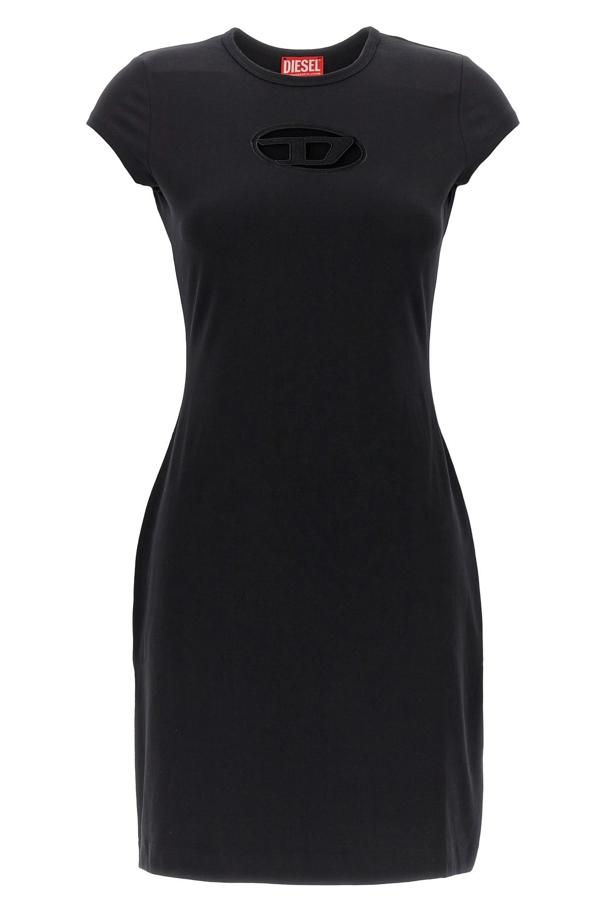 cod. A062700AFAA9XXA T-Angie crewneck dress in stretch cotton with short sleeves and embroidered logo with cut-out details on the front. Color: Black Size & Fit: true to size fit Composition: 93% cotton, 7% elastane Made in: China