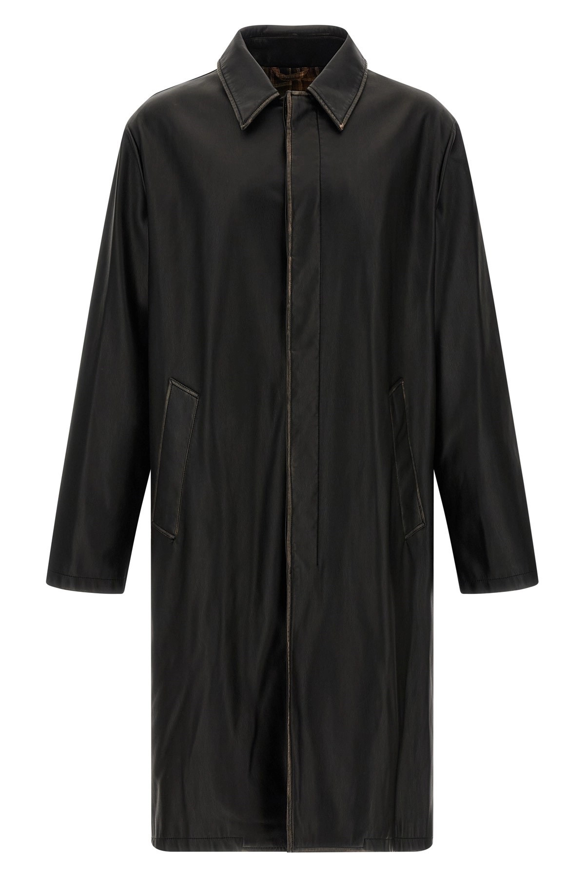 cod. A184960LHBE9XX Car coat 'J-Rivers' in distressed leather-effect brushed shiny fabric, check flannel lining, shirt collar, front button closure, pockets, long sleeves with embossed logo, back vent. Color: Black Size & Fit: true to size fit Composition: 100% polyester Made in: China