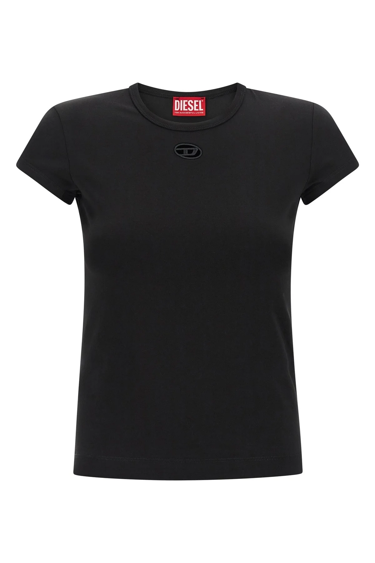cod. A199120AFAA9XX 'T-Angie-Od' stretch cotton T-shirt with front logo embroidery with cut-out detail, crew neck, short sleeves. Color: Black Size & Fit: True to size fit Composition: 93% cotton, 7% elastane Made in: China