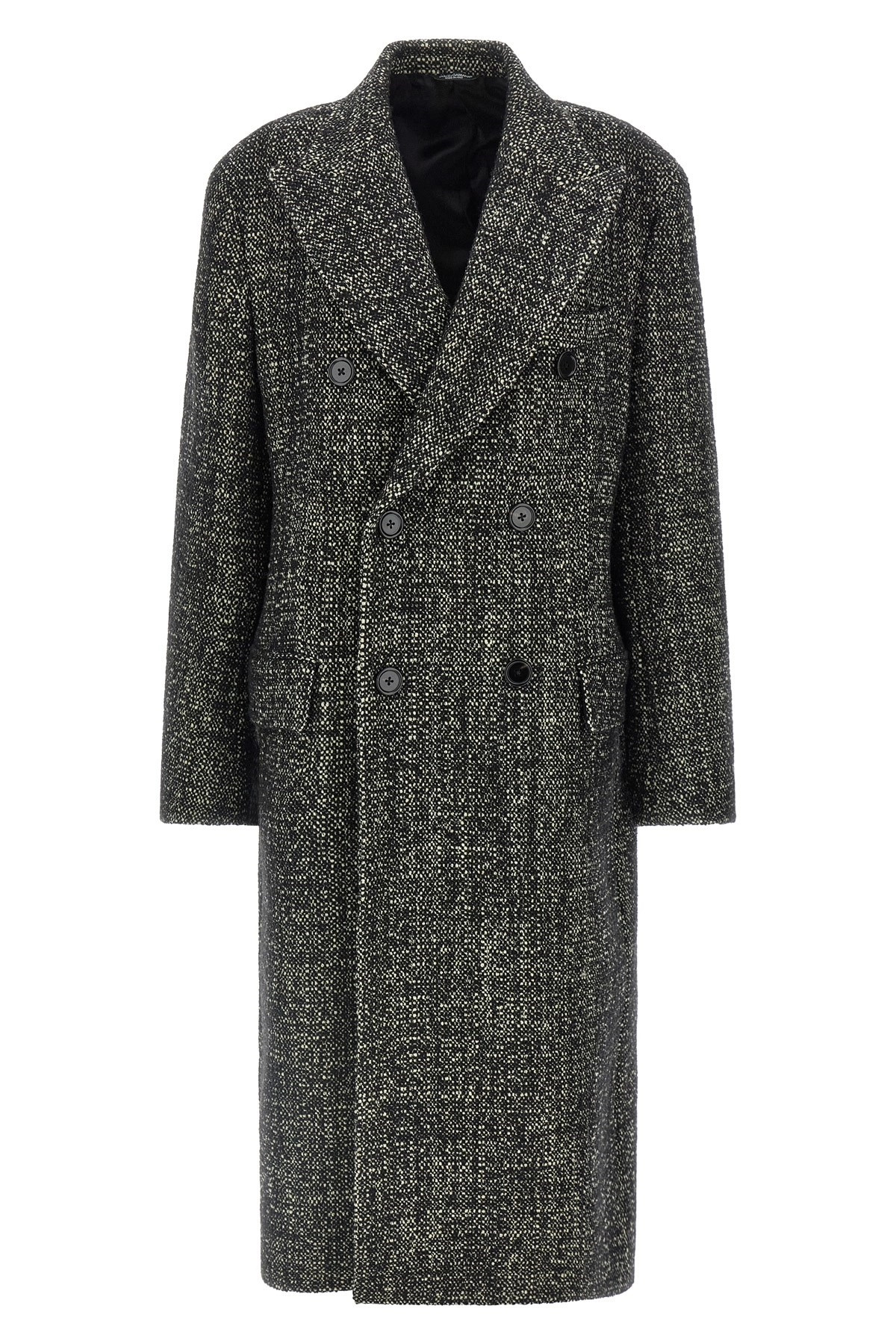 cod. G050LTFMZAQS8030 Two-breasted long coat in wool and cashmere boucle with front button closure, lapel collar, breast pocket, flap pockets, structured shoulder strap, long sleeves, cuffs with open buttonholes, back split, viscose lining. Color: White/Black Size & Fit: true to size fit Composition: 12% PA 1% WS 87% WV Made in: Italy