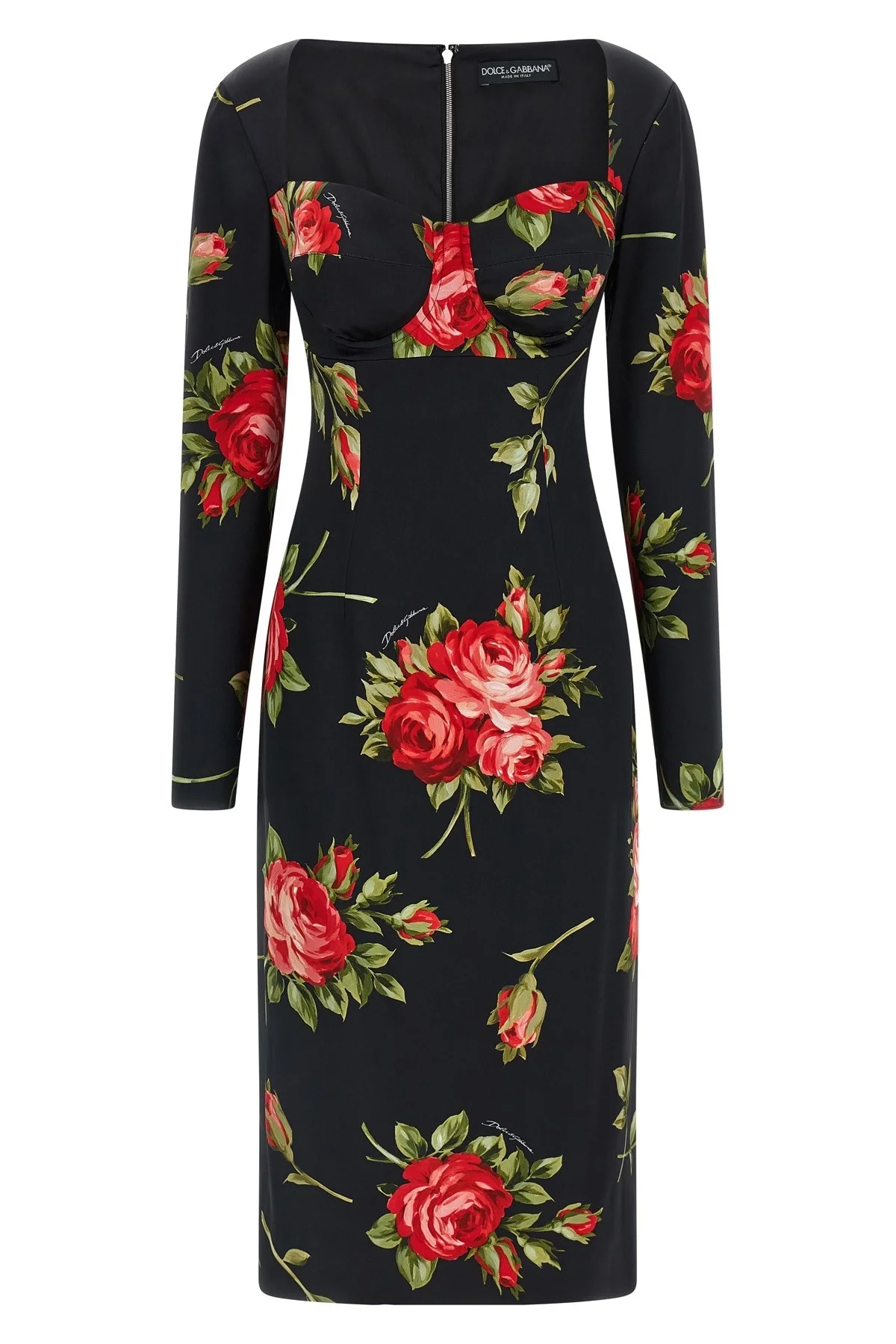 cod. F610FTFSICDHN5ZN 'Bouquet Rose' print satin midi dress, sheath dress, front heart-shaped neckline with bustier structure and pre-shaped cups, long sleeves, zip closure, back split, lining. The differences in print placement you might find on this product is a characteristic of Dolce&Gabbana's Handmade products. A peculiarity that makes each garment or accessory unique and exclusive. Color: Black Size & Fit: true to size fit Composition: 96% viscose, 4% elastane Made in: Italy