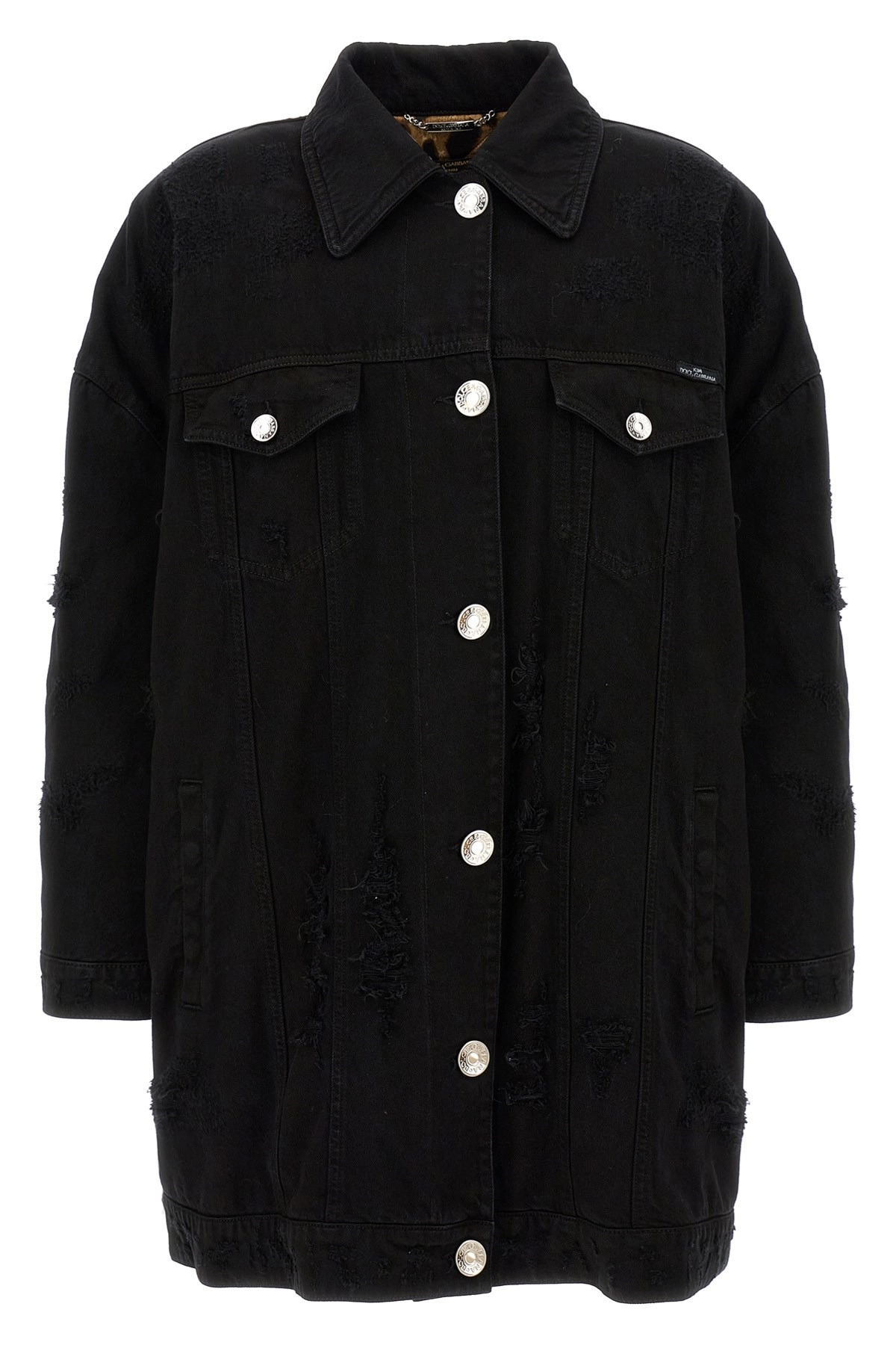 cod. F9P47DG8HL7S9001 Long jacket in slightly padded used-effect denim lined with leopard-print stretch satin, metal logo plaque on the back, button closure, pockets, long cuffed sleeves. Color: Black Size & Fit: oversized fit Composition: 100% cotton Made in: Italy