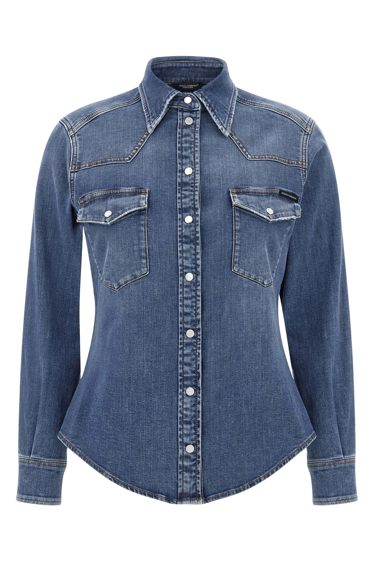 cod. F5T64DG8NR6S9001 Used-effect cotton denim shirt with contrast stitching, front snap button closure, pockets, long cuffed sleeves, leather and metal tag with engraved logo on the back. Color: Blue Size & Fit: Slim fit Composition: 98% cotton, 2% elastane Made in: Italy