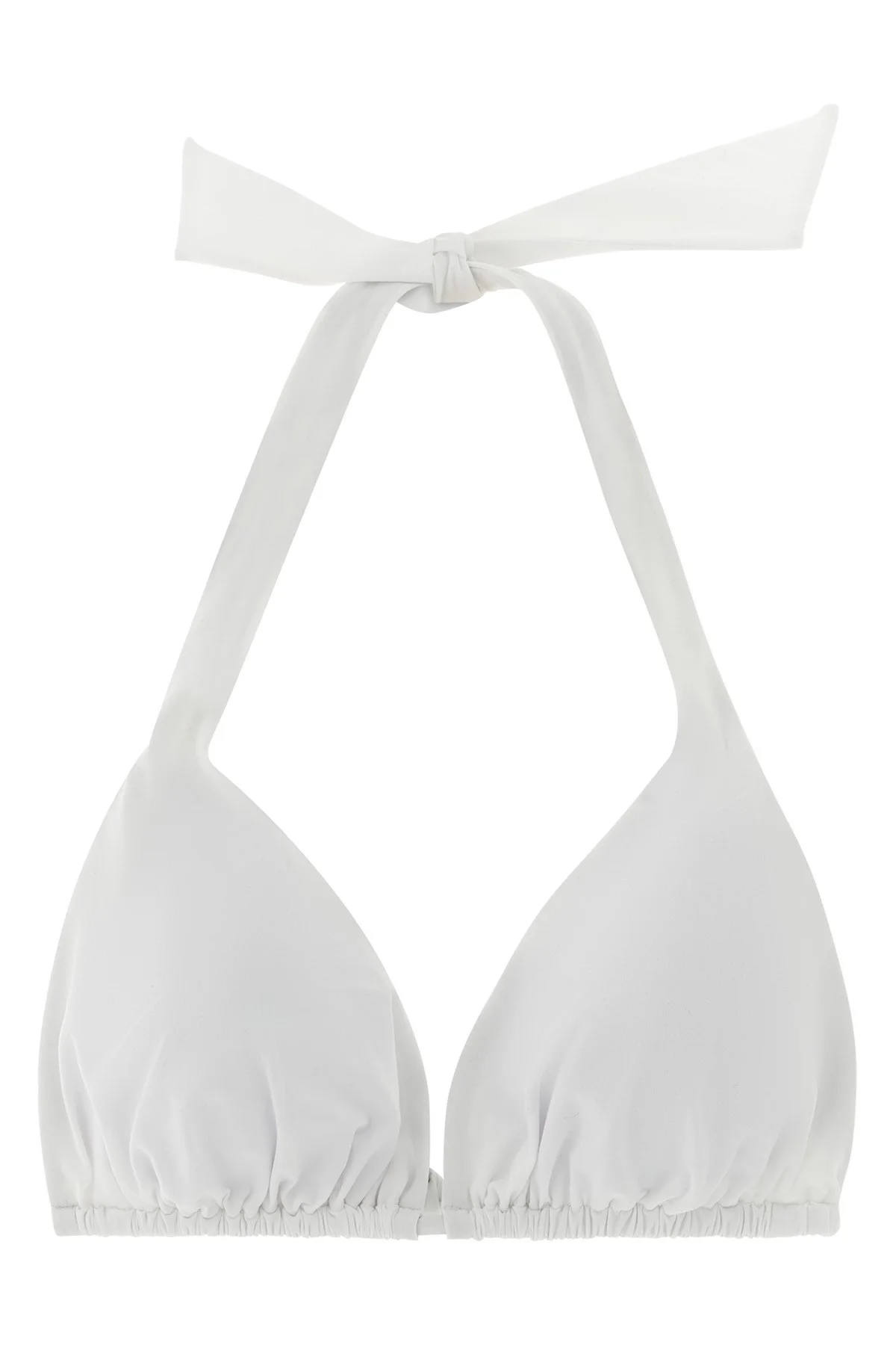 cod. O1A01JONO12W0800 Bikini top in precious sensitive fabric, triangle model with removable padding, metal 'DG' logo on the front, adjustable and knotted laces. Color: White Size & Fit: true to size fit Composition: 75% polyamide, 25% elastane Made in: Italy