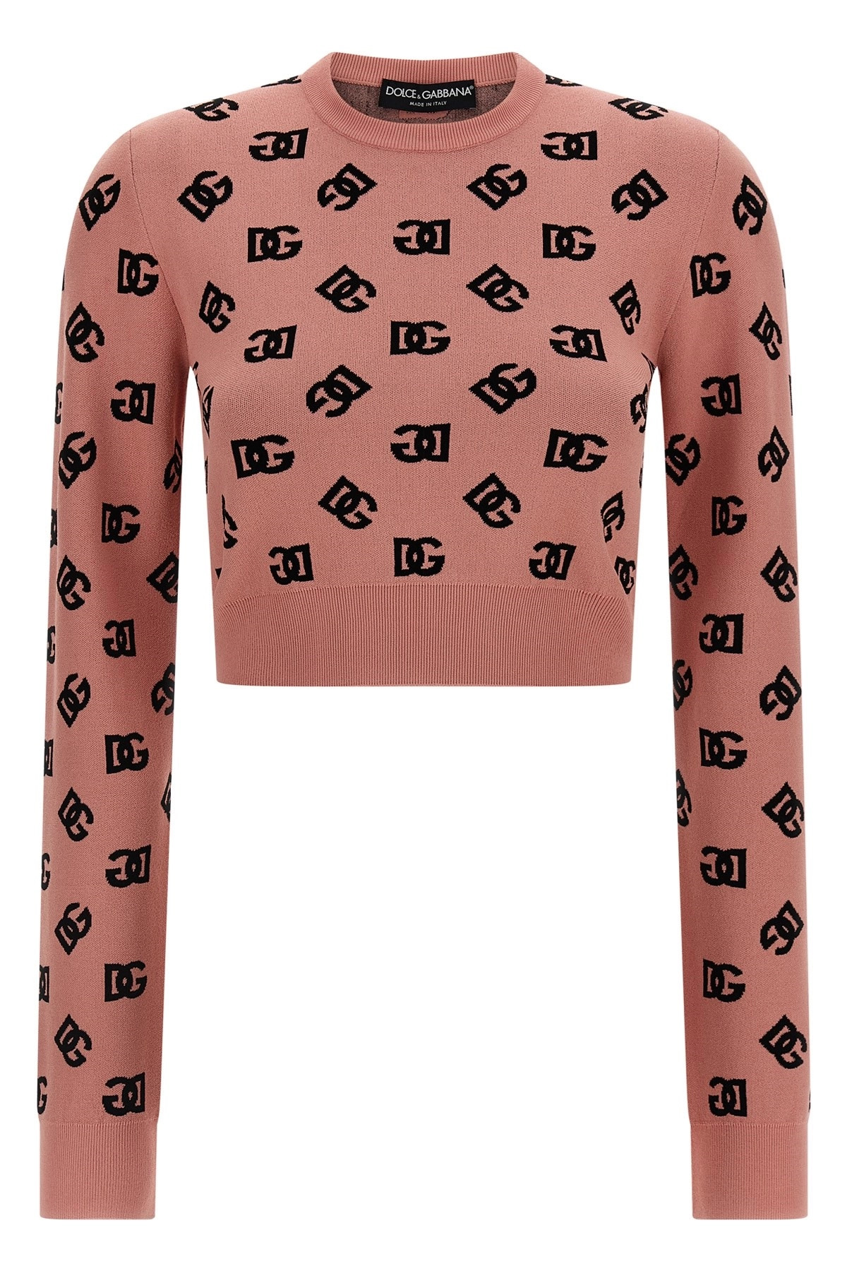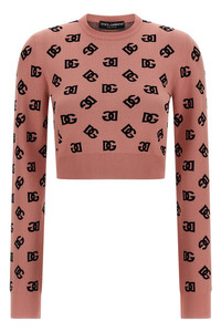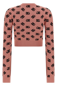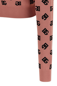 cod. FXI12TJFMGTF0473 Stretch viscose blend sweater with all-over DG monogramm jacquard logo, crop model, crew neck, long cuffed sleeves. Color: Pink Size & Fit: true to size fit Composition: 83% viscose, 17% polyester Made in: Italy