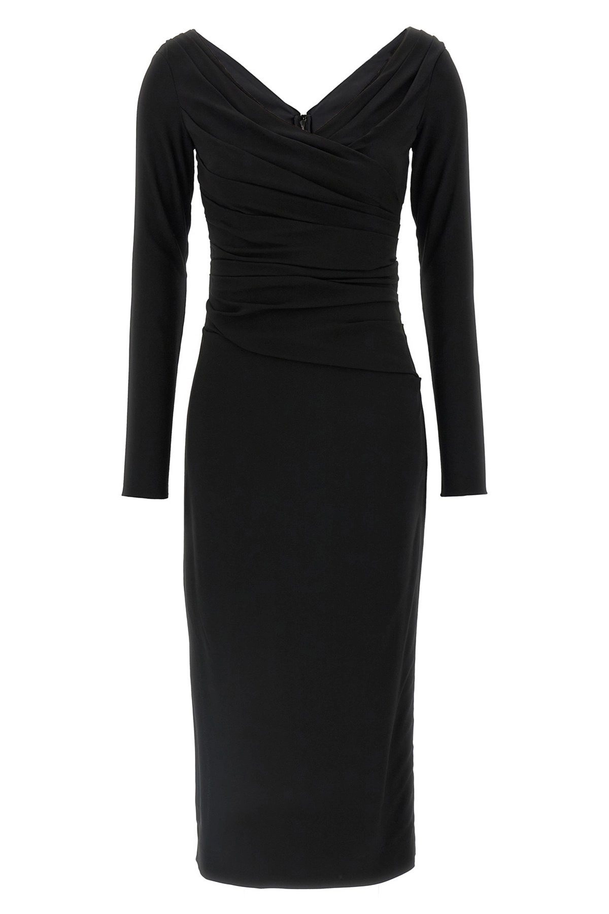 cod. F6TMWTFURGGN0000 Midi dress in viscose blend and stretch silk, V-neck, front and back draping, long sleeves, back zip closure, side split. Color: Black Size & Fit: true to size fit Composition: 69% viscose 25% silk 6% elastane Made in: Italy