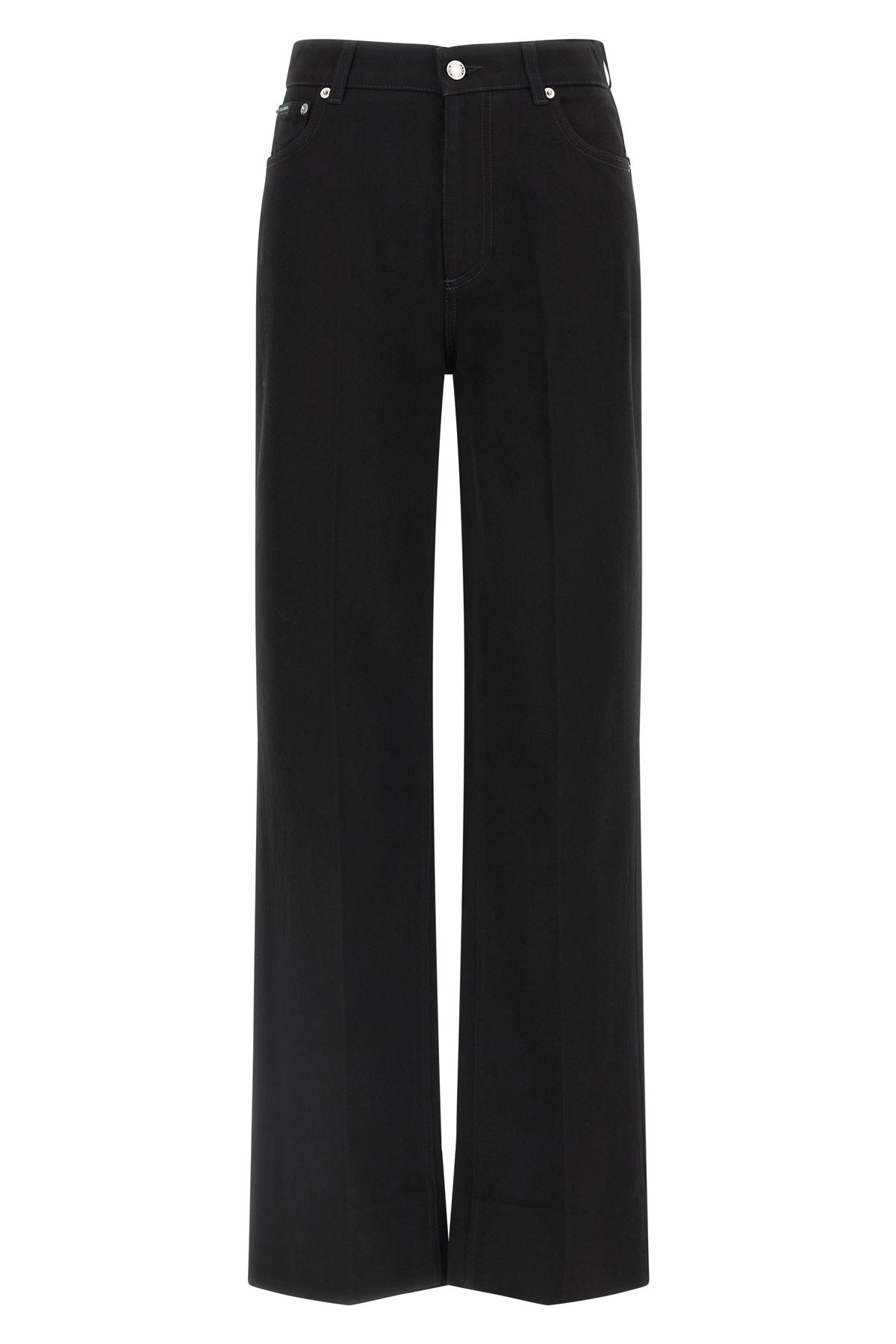 cod. FTC79DG8NC2S9001 Cotton denim pants, flared leg, front stretched pleat, 5 pockets, zip and button closure, back metal plaque with logo. Color: Black Size & Fit: True to size fit Composition: 100% cotton Made in: Italy