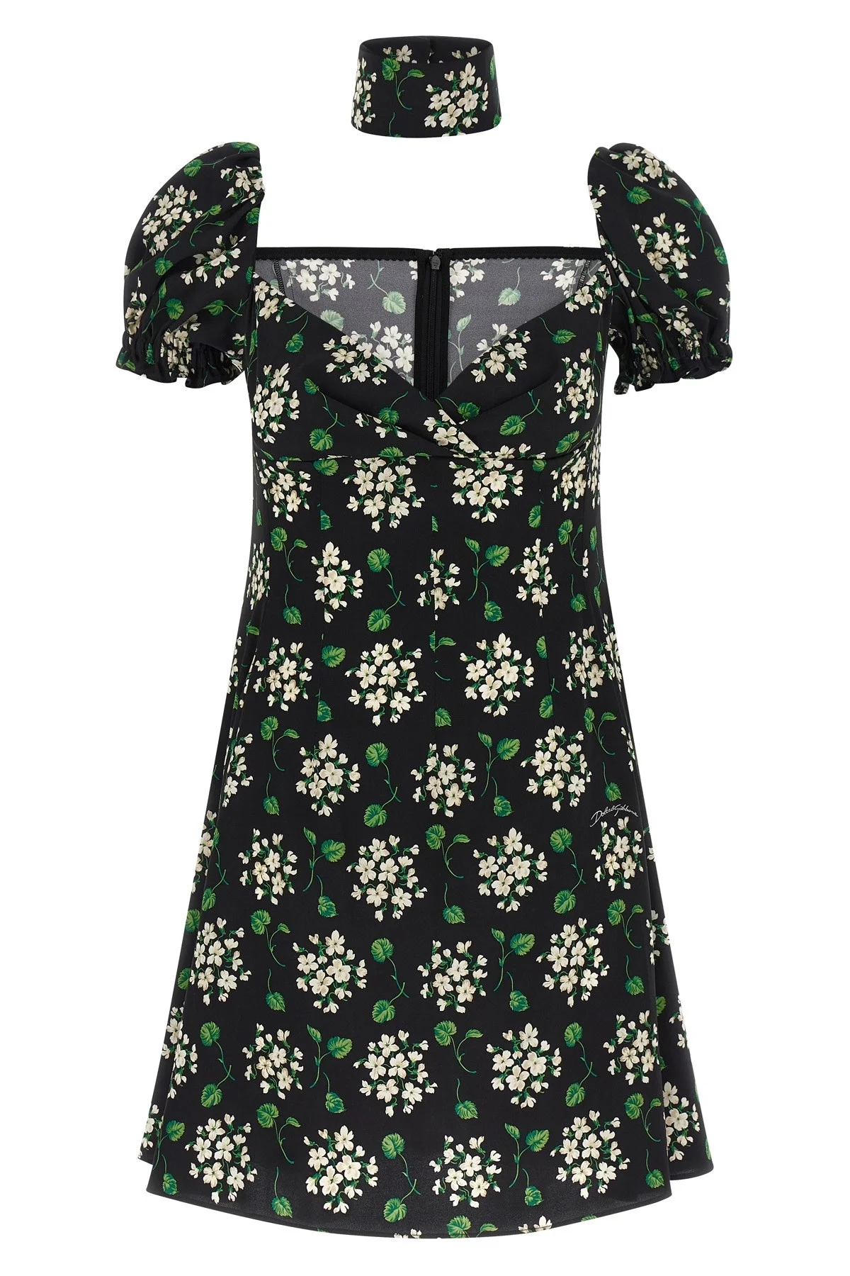 cod. F659HTFSA85HX6BX Mini dress in all-over floral print silk charmeuse, slightly flared model, sweetheart neckline, short sleeves curled with elastic, back closure with hidden zip, collar detail with buttons. Color: Black Size & Fit: True to size fit