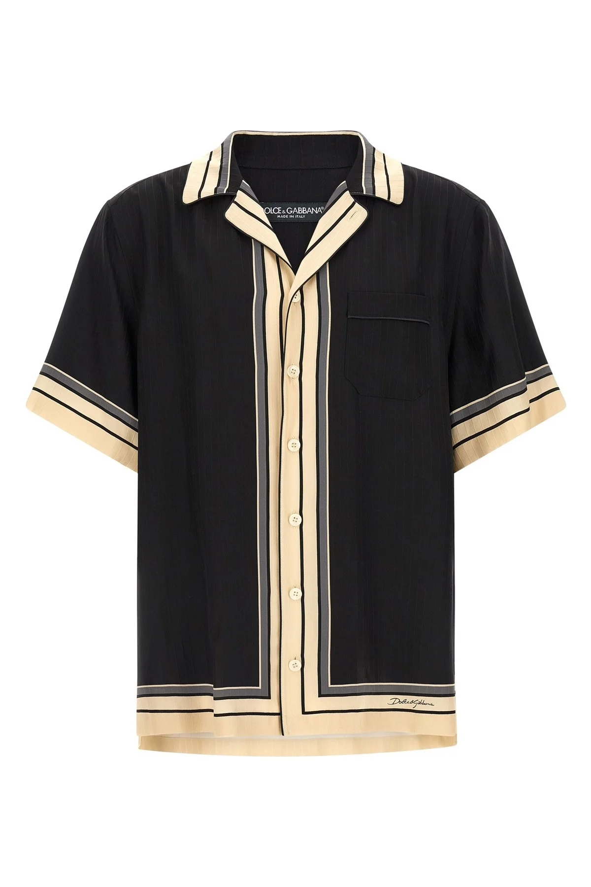 cod. G5LH3THI11THN5WH 'Hawaii' silk shirt with logo and stripe print, 'Vanity' collar, breast pocket, front button closure, short sleeves, side slits. The differences in print placement you might find on this product is a characteristic of Dolce&Gabbana's Handmade products. A peculiarity that makes each garment or accessory unique and exclusive. Color: Black Size & Fit: true to size fit - COLLAR size Composition: 100% silk Made in: Italy