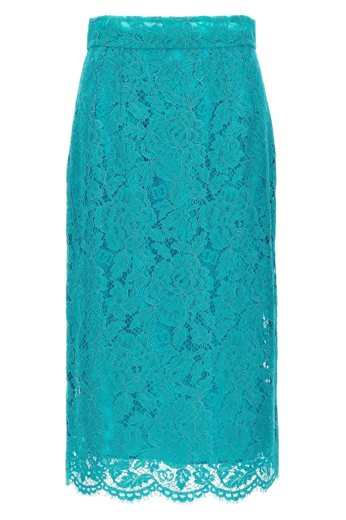 cod. F4B7ITHLM7LB4469 High-waisted floral cordonetto lace skirt, silk crepe de chine underskirt, back zip closure. Color: Light Blue Size & Fit: true to size fit Composition: 34% cotton 23% polyamide 43% vi