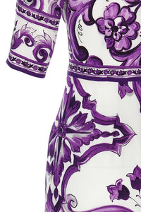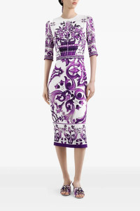 cod. F6EAJTHPAELIP3TN Silk charmeuse midi dress with all-over 'Maiolica' print, round neckline, 3/4 sleeves, front and back waist pinch, sheath skirt, zip closure and back split, solid silk lining. The differences in print placement that you may find on this product is a feature of Dolce&Gabbana's "Handmade" pieces, making each garment unique and exclusive. Color: Purple Size & Fit: Slim fit Composition: 94% silk 6% elastane Made in: Italy