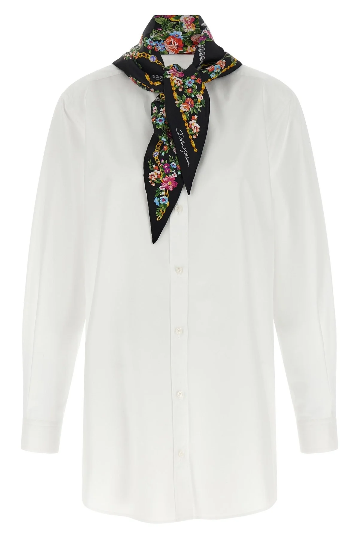 cod. F5U17TGDDOXW0800 Cotton poplin shirt, mandarin collar, front mother-of-pearl button closure, long cuffed sleeves, patterned triangle silk scarf fixed on the neckline with buttons and removable. Color: White Size & Fit: true to size fit Composition: 70% cotton, 30% silk Made in: Italy