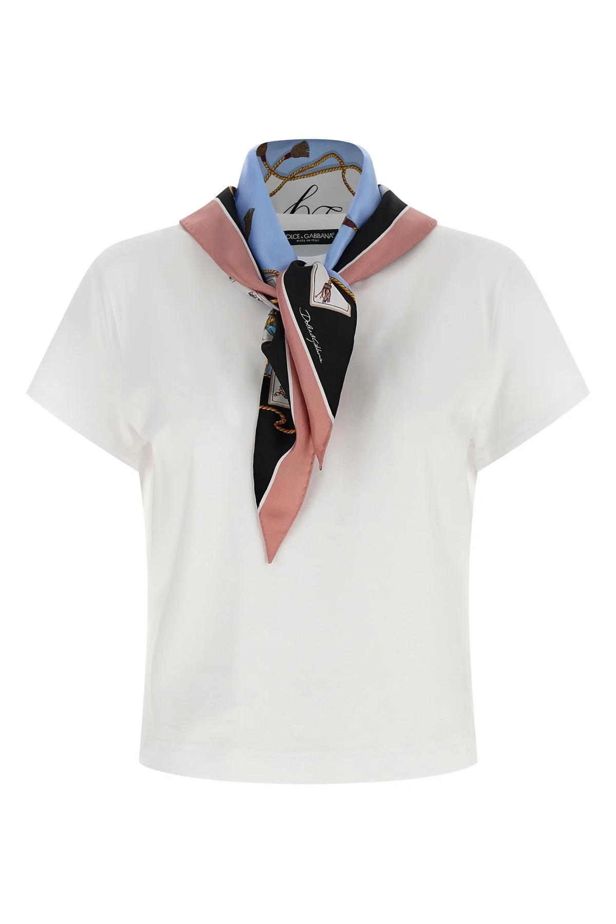 cod. F8W31ZGDDPEW0800 Cotton jersey T-shirt with tone-on-tone logo embroidery on the front, crew neck, short sleeves, patterned triangle silk scarf fixed on the neckline with buttons and removable. Color: White Size & Fit: true to size fit Composition: 62% cotton 30% silk 8% elastane Made in: Italy