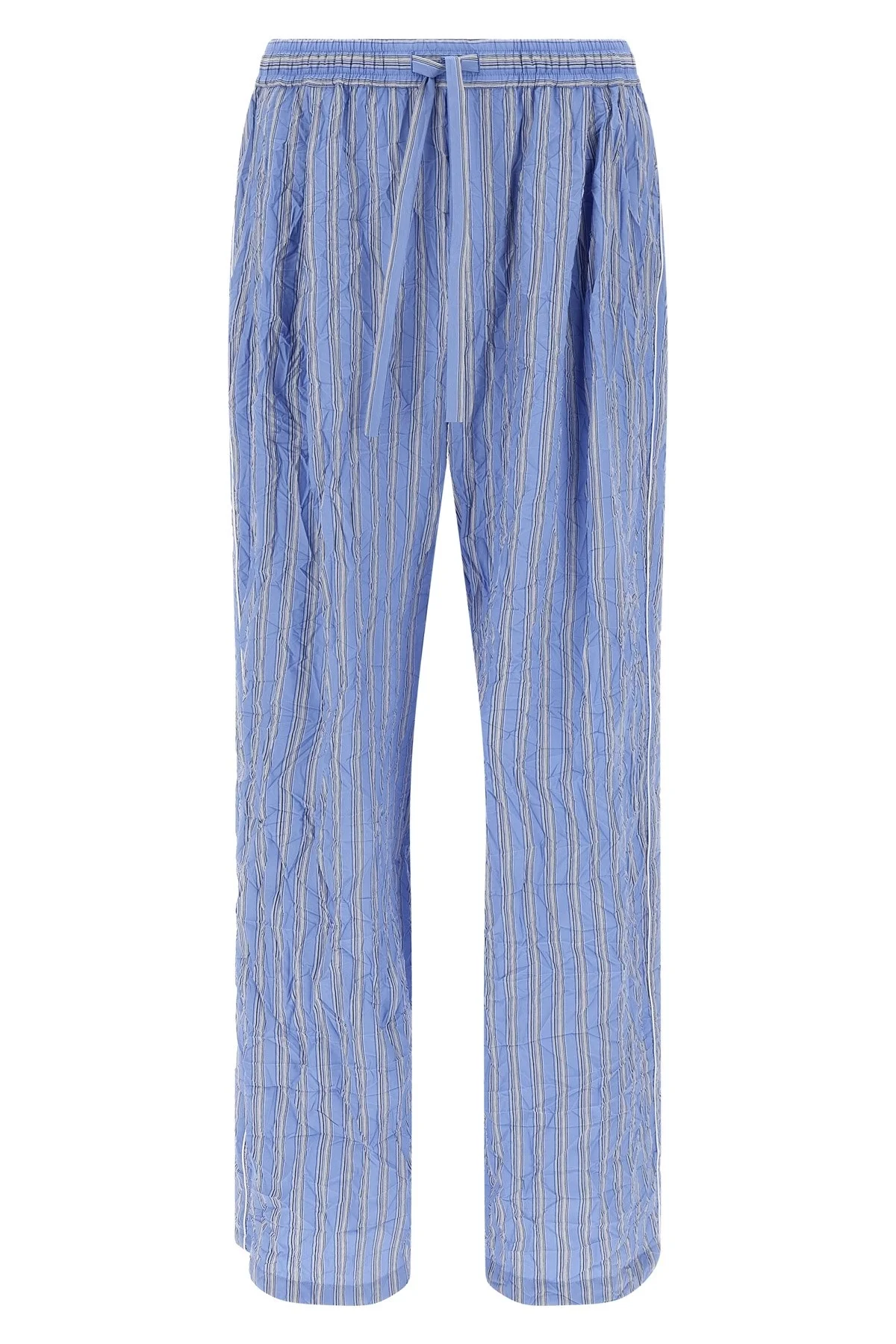 cod. GP1N9TFBMFSS8053 'Vanity' pants in cotton and silk blend canvas froisse patterned striped, pajama model, wide and straight leg, drawstring elastic waistband, trompe l'oeil flap, pockets, solid color piping on the side. The crinkled effect of the crinkle fabrics is obtained during the finishing phase, through a special process that uses heat to modify the structure of the fibers and permanently create the wrinkled appearance of the garment. To preserve the wrinkled effect, the garment should not be washed with water or ironed. The only recommended treatment is dry cleaning. Color: Light Blue Size & Fit: true to size fit Composition: 85% viscose 13% polyamide 2% silk Made in: Italy