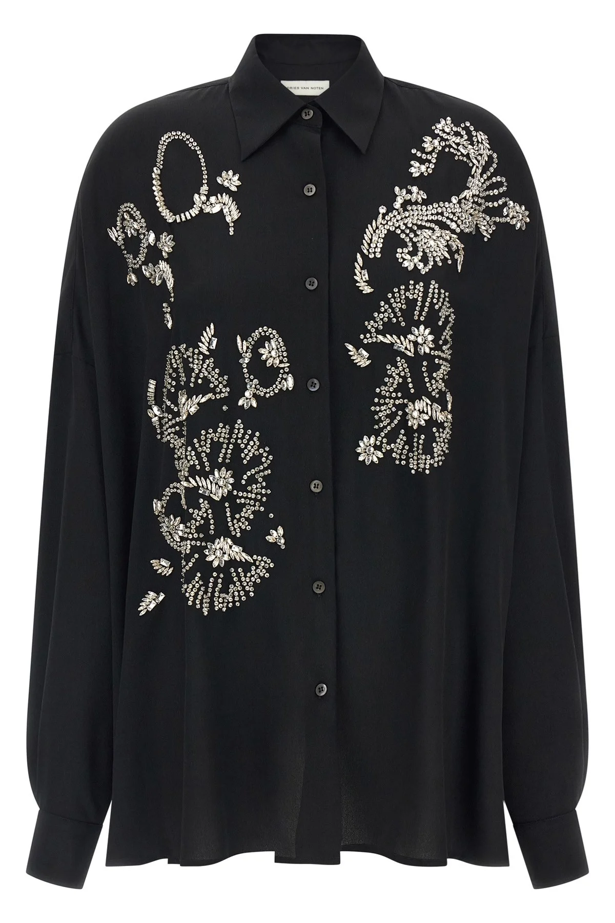 cod. 2610107593078900 'Casia' fabric shirt with crystal applique on the front and back, pointed collar, front button closure, long sleeves with cuffs and dropped shoulders, asymmetrical hem. Color: Black Size & Fit: oversized fit Composition: 100% polyester Made in: India