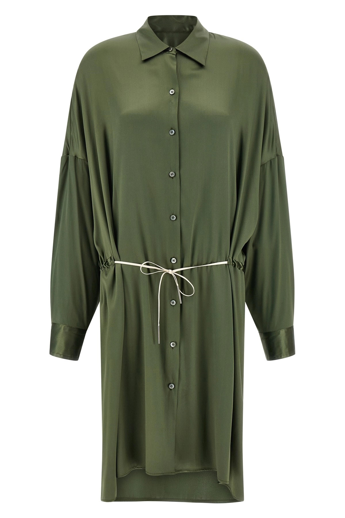 cod. 2520110832032606 'Dinidia' silk satin dress, shirt style with shirt collar and front button closure, adjustable drawstring at the waist, long sleeves with cuffs. Color: Green Size & Fit: True to size fit Composition: 94% silk 6% elastane Made in: Poland