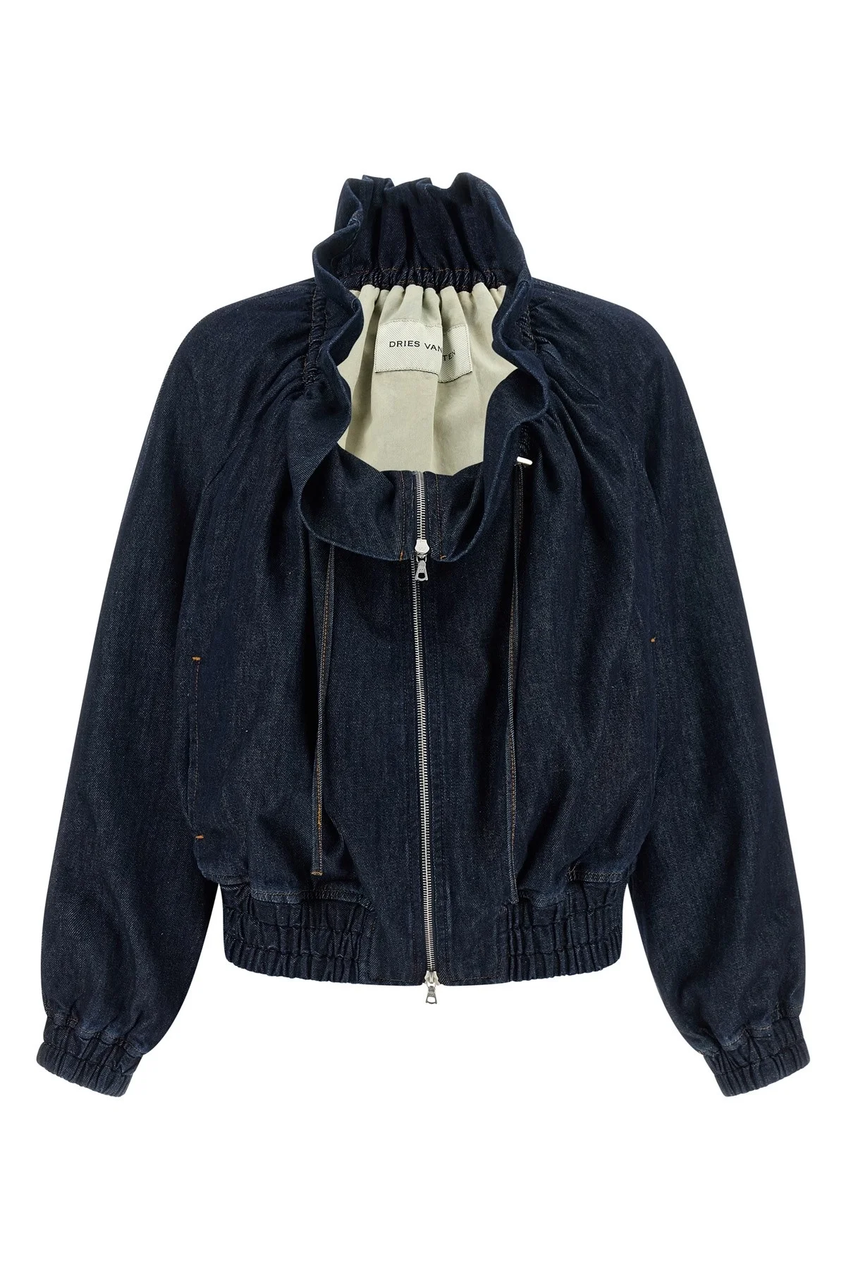 cod. 2611305183385507 'Voly' cotton denim jacket with contrast stitching, curled neckline with adjustable drawstring, front zip closure, elastic hem, pockets, long sleeves with elastic cuffs. Color: Blue Size & Fit: comfort fit - FRENCH size Composition: 100% cotton Made in: Tunisia