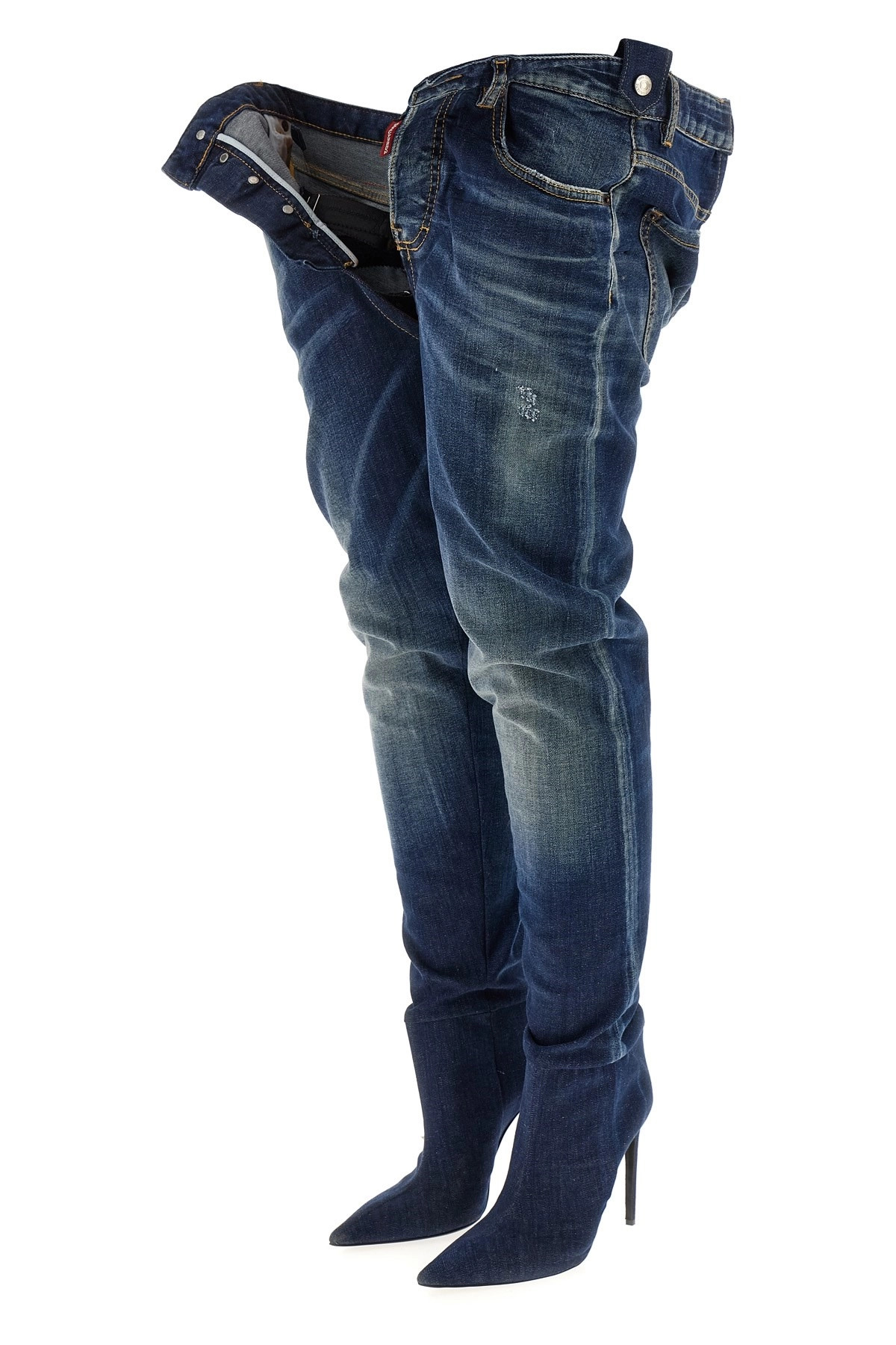 cod. BOW0091101000013096 Bettter x Dsquared2 capsule boots in used-effect stonewashed cotton denim, pointed toe, adjustable elastic stringer, stiletto heel, leather sole. Product made using an upcycling process: each piece is unique and different. Please contact us to find out which colors are available in your size. Color: Blue Size & Fit: EU WOMAN - Heel: 12 cm Composition: 100% cotton Made in: Italy