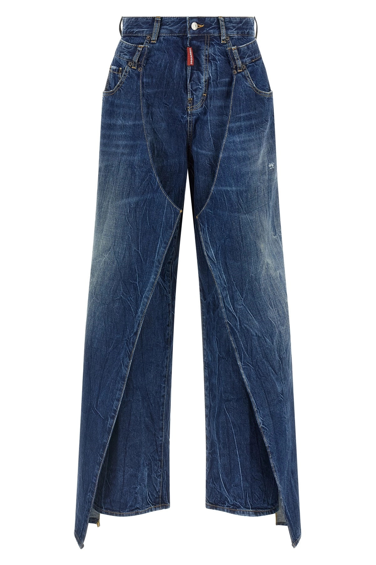 cod. S73LA0304DTN023961 Bettter x Dsquared2 'Double Wrap' used-effect stonewashed cotton denim jeans with all-over wrinkles, contrast stitching, double layer fabric and front button closure, five pockets, wide straight leg, back logo tag. Color: Blue Size & Fit: true to size fit Composition: 100% cotton Made in: Italy