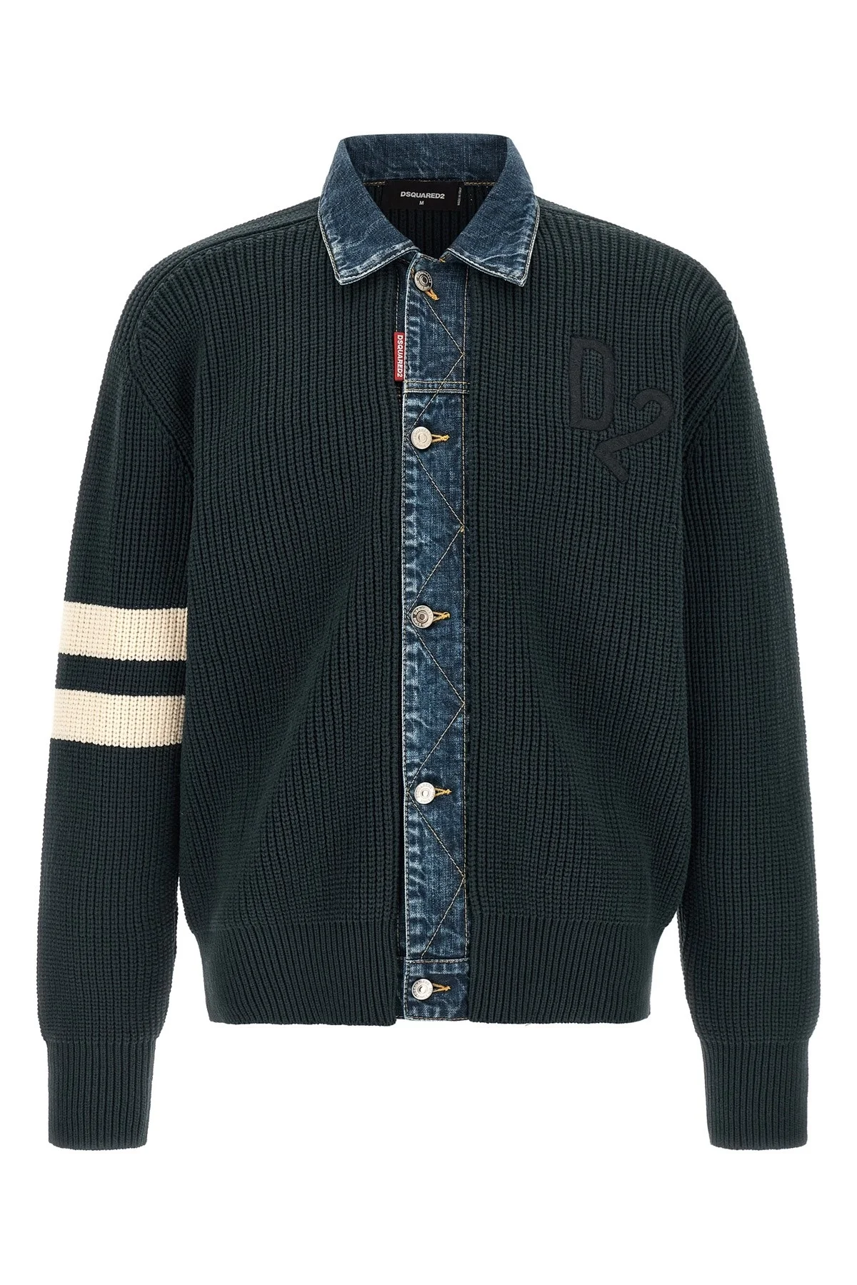 cod. S74HA1591D13185962 Denim Mix D2' cotton blend knit cardigan with stonewashed cotton denim details with contrast stitching, shirt collar, tone-on-tone logo embroidery and front button closure, long cuffed sleeves, dropped shoulders, contrast jacquard stripes, and headband on the hem. Color: Blue Size & Fit: oversized fit Composition: 60% cotton 40% polyamide Made in: Italy