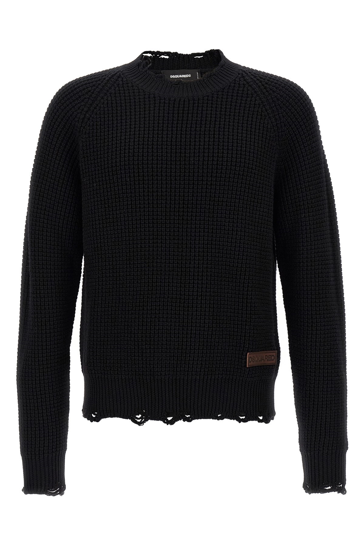 cod. S74HA1446D13040900 Wool crewneck sweater with side logo patch, 'destroyed' details on the hem and cuffs, long sleeves. Color: Black Size & Fit: True to size fit Composition: 100% wool Made in: Italy