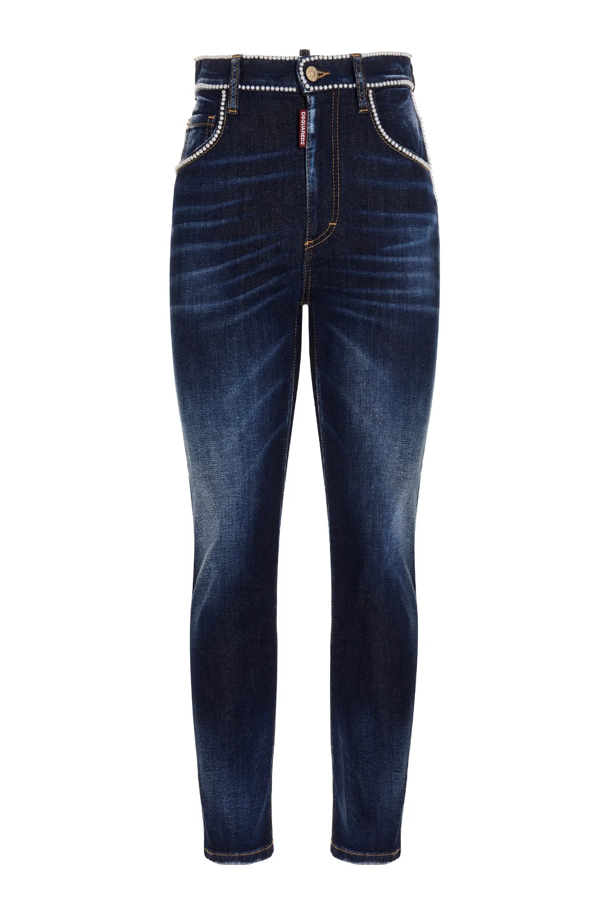 cod. S75LB0552S30685470 'High Waist Cropped Twiggy Jean' cotton denim jeans with a zip and button, five pockets with a pearl decoration, fabric washed effect with worn details, cropped twiggy fit. Color: Blue Size & Fit: True to size fit Composition: 98% cotton 2% elastane Made in: Italy
