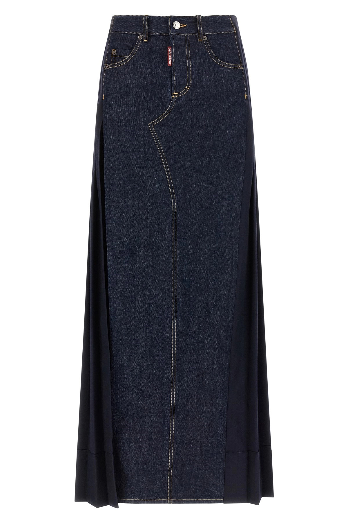 cod. S75MA1004DTN016961 Osaka' long wool skirt with cotton denim front insert, button closure, five pockets, side pleats and wide front split. Color: Black Size & Fit: true to size fit Composition: 100% cotton Made in: Italy